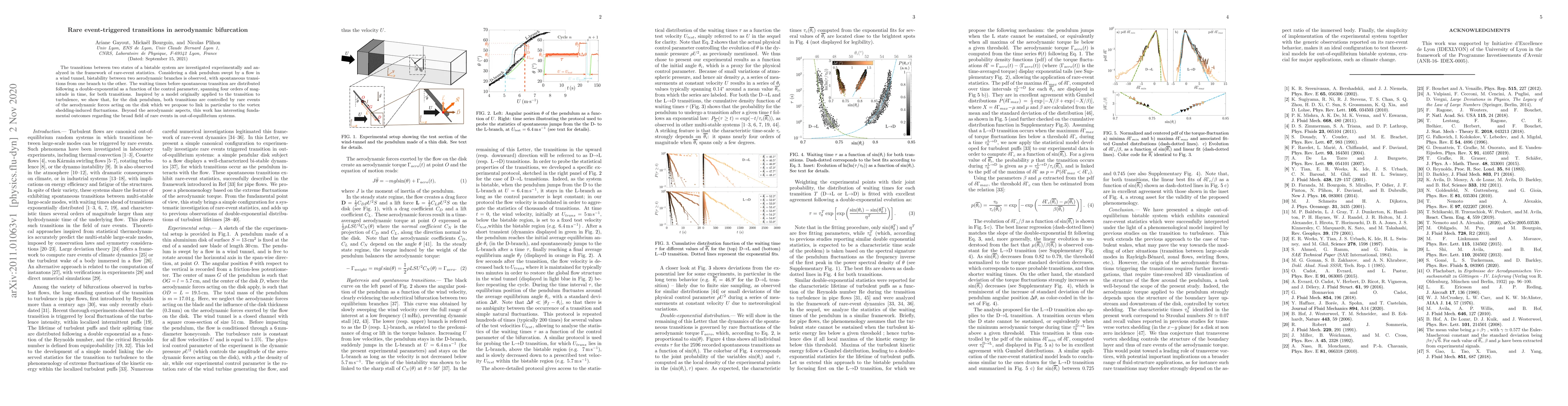 The transitions between two states of a bistable system are investigated experimentally and analyzed in the framework of rare-event statistics. Considering a disk pendulum swept by a flow in a wind tunnel, bistability between two aerodynamic branches is observed, with spontaneous transitions from one branch to the other. The waiting times before spontaneous transition are distributed following a double-exponential as a function of the control parameter, spanning four orders of magnitude in time, for both transitions. Inspired by a model originally applied to the transition to turbulence, we show that, for the disk pendulum, both transitions are controlled by rare events of the aerodynamic forces acting on the disk which we propose to link in particular to the vortex shedding-induced fluctuations. Beyond the aerodynamic aspects, this work has interesting fundamental outcomes regarding the broad field of rare events in out-of-equilibrium systems.