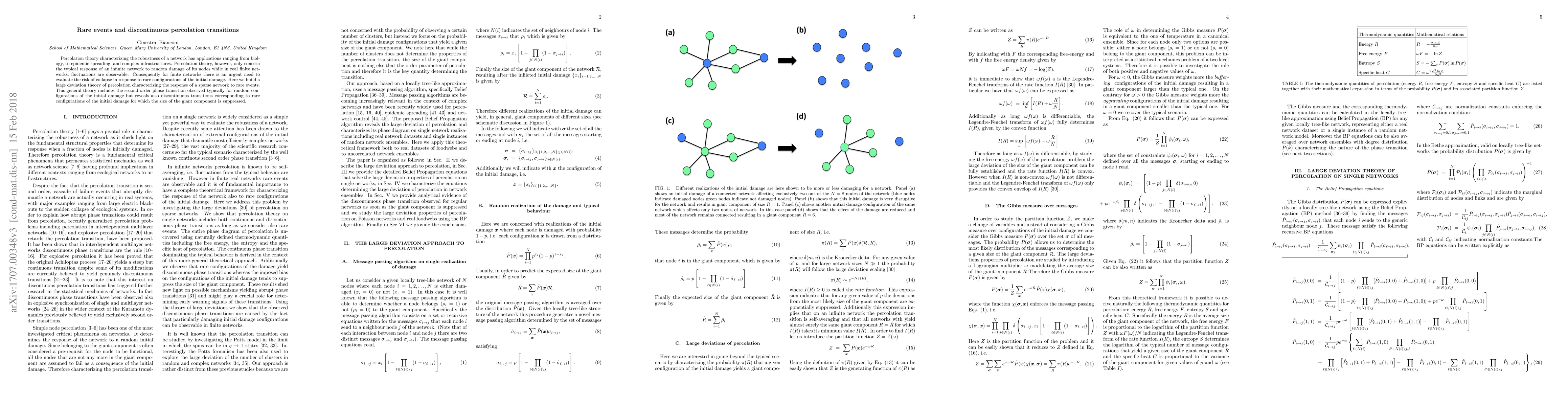 This paper develops a large deviation theory to analyze the robustness of sparse networks under rare configurations of node damage, revealing discontinuous percolation transitions alongside typical second-order transitions. The findings highlight the risk of collapse in finite networks due to unusual initial damage patterns.