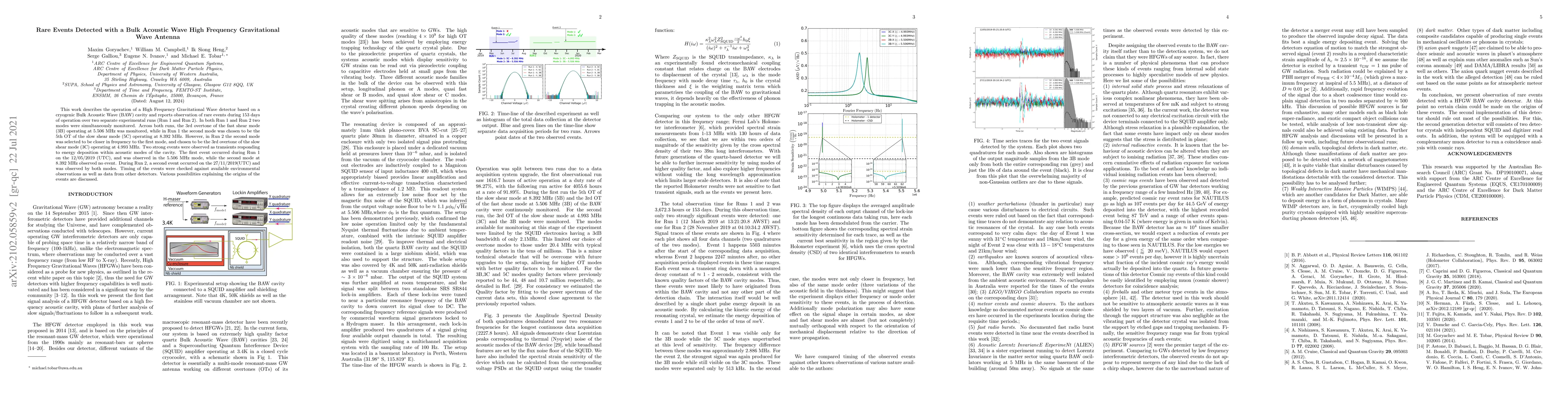 This work describes the operation of a High Frequency Gravitational Wave detector based on a cryogenic Bulk Acoustic Wave (BAW) cavity and reports observation of rare events during 153 days of operation over two seperate experimental runs (Run 1 and Run 2). In both Run 1 and Run 2 two modes were simultaneously monitored. Across both runs, the 3rd overtone of the fast shear mode (3B) operating at 5.506 MHz was monitored, while in Run 1 the second mode was chosen to be the 5th OT of the slow shear mode (5C) operating at 8.392 MHz. However, in Run 2 the second mode was selected to be closer in frequency to the first mode, and chosen to be the 3rd overtone of the slow shear mode (3C) operating at 4.993 MHz. Two strong events were observed as transients responding to energy deposition within acoustic modes of the cavity. The first event occurred during Run 1 on the 12/05/2019 (UTC), and was observed in the 5.506 MHz mode, while the second mode at 8.392 MHz observed no event. During Run 2, a second event occurred on the 27/11/2019(UTC) and was observed by both modes. Timing of the events were checked against available environmental observations as well as data from other detectors. Various possibilities explaining the origins of the events are discussed.