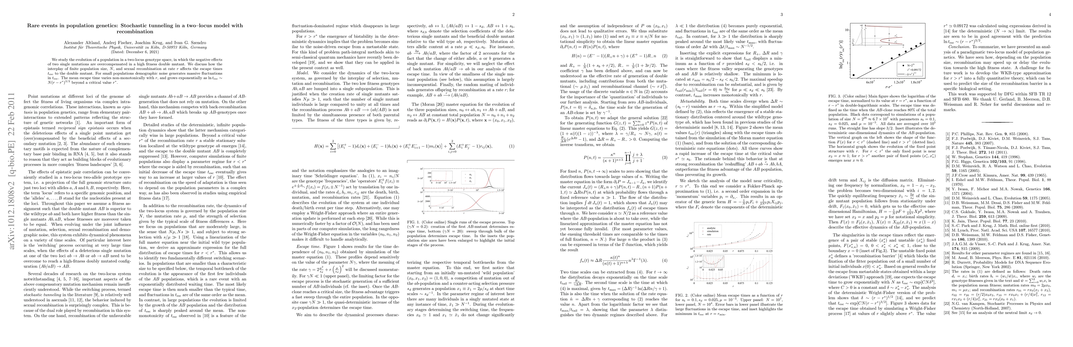 This paper investigates the stochastic tunneling process in a two-locus population genetics model, focusing on the escape times to a high fitness double mutant. It highlights the impact of population size and recombination rate on these escape times, revealing non-monotonic behavior and exponential growth beyond a critical recombination threshold.