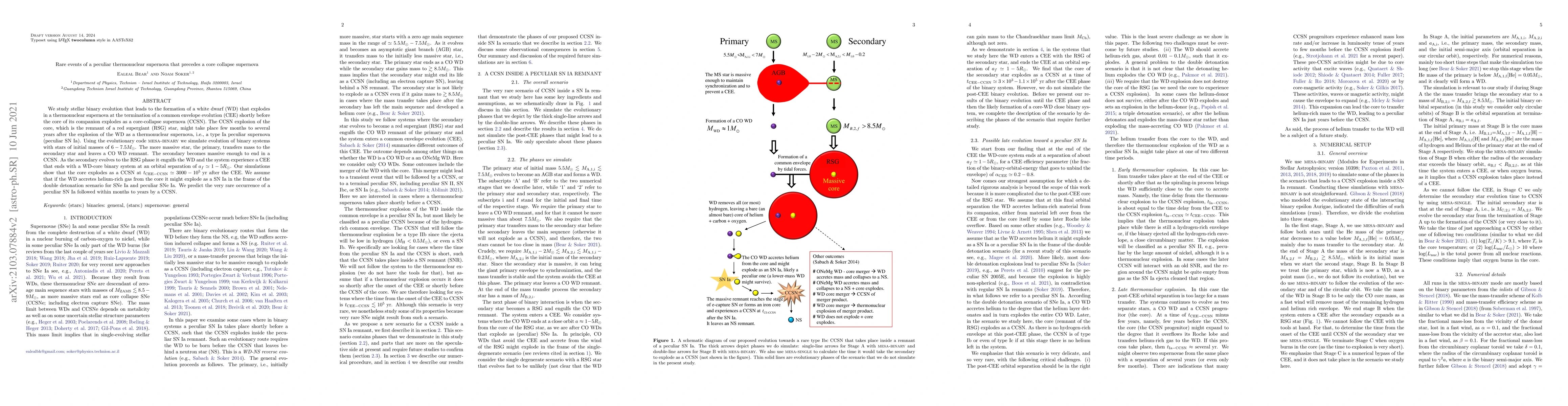 This paper investigates the rare occurrence of a thermonuclear supernova (peculiar SN Ia) from a white dwarf in a binary system, followed by a core-collapse supernova (CCSN) from its companion star. The study uses MESA-binary simulations to model the evolution of binary systems, predicting the peculiar SN Ia may happen shortly before the CCSN from the red supergiant companion, separated by months to years.