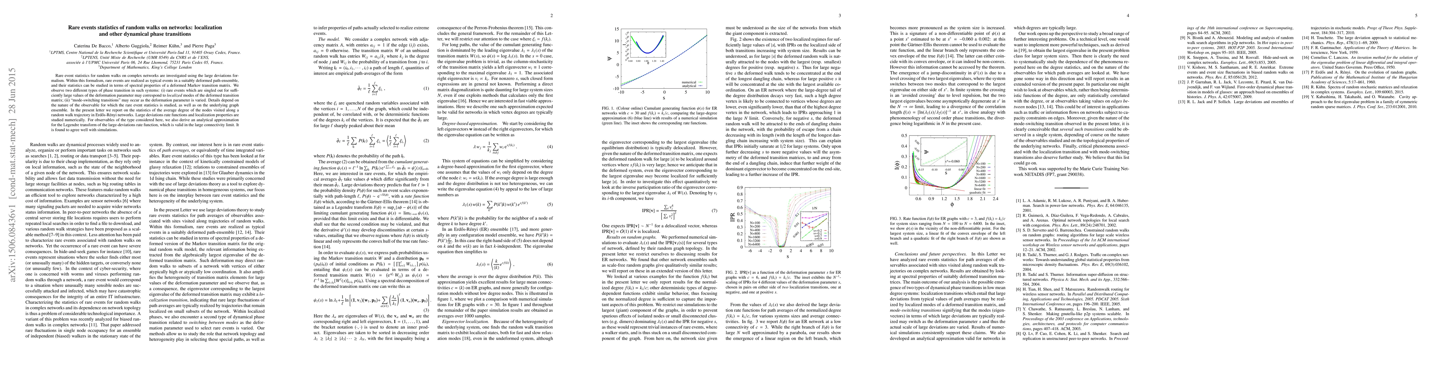 This paper investigates rare event statistics in random walks on complex networks using large deviations formalism, identifying two types of phase transitions: localization and mode-switching. Numerical and analytical studies focus on the average degree of nodes visited in Erdős-Rényi networks, showing good agreement between simulations and derived approximations.