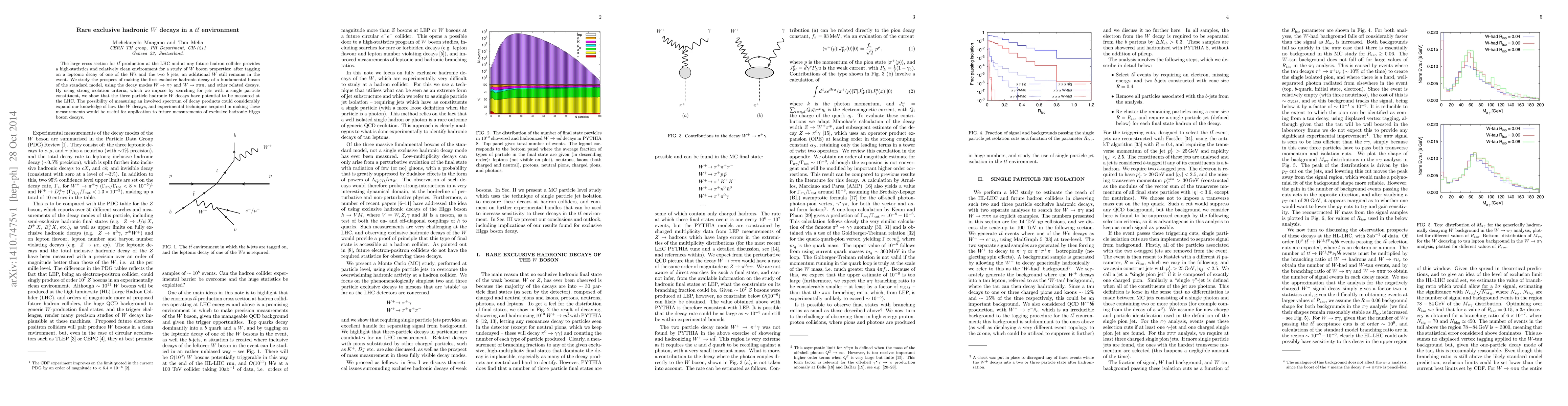 This paper explores the potential of the LHC to observe rare exclusive hadronic decays of W bosons within t-tbar events, specifically focusing on W to pi gamma and W to pi pi pi decays. The study demonstrates that stringent isolation criteria can enable the measurement of these decays, which could enhance our understanding of W boson properties and inform future Higgs boson decay studies.