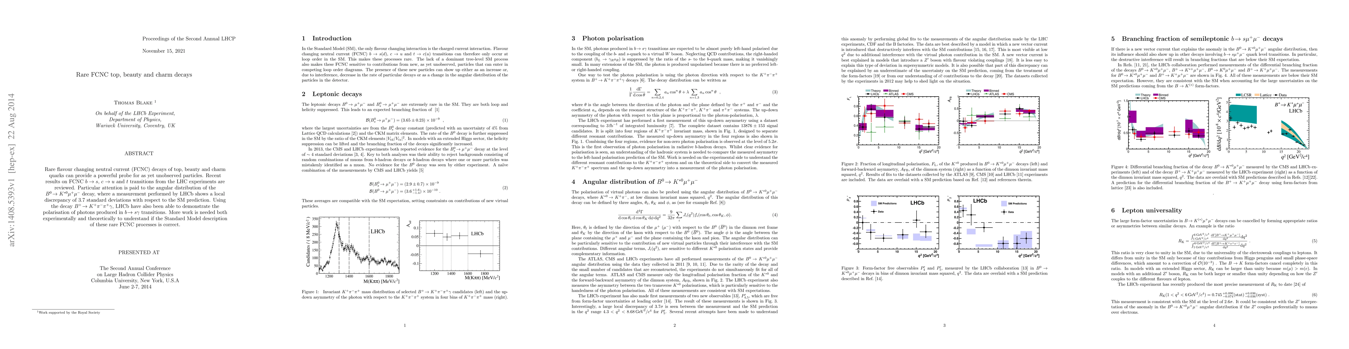 The research reviews recent results on flavour changing neutral current (FCNC) transitions for top, beauty, and charm quarks from LHC experiments, focusing on angular distributions and polarization in decays such as $B^0 \to K^{*0} \mu^+ \mu^-$ and $B^+ \to K^+ \pi^- \pi^+ \gamma$.