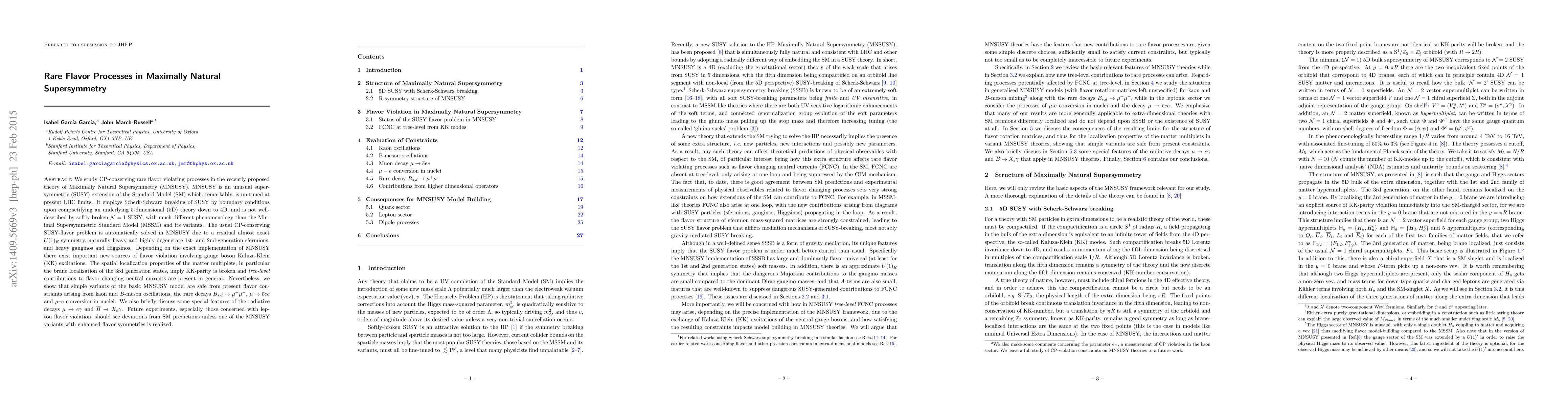 We study CP-conserving rare flavor violating processes in the recently proposed theory of Maximally Natural Supersymmetry (MNSUSY). MNSUSY is an unusual supersymmetric (SUSY) extension of the Standard Model (SM) which, remarkably, is un-tuned at present LHC limits. It employs Scherk-Schwarz breaking of SUSY by boundary conditions upon compactifying an underlying 5-dimensional (5D) theory down to 4D, and is not well-described by softly-broken $\mathcal{N}=1$ SUSY, with much different phenomenology than the Minimal Supersymmetric Standard Model (MSSM) and its variants. The usual CP-conserving SUSY-flavor problem is automatically solved in MNSUSY due to a residual almost exact $U(1)_R$ symmetry, naturally heavy and highly degenerate 1st- and 2nd-generation sfermions, and heavy gauginos and Higgsinos. Depending on the exact implementation of MNSUSY there exist important new sources of flavor violation involving gauge boson Kaluza-Klein (KK) excitations. The spatial localization properties of the matter multiplets, in particular the brane localization of the 3rd generation states, imply KK-parity is broken and {\it tree-level} contributions to flavor changing neutral currents are present in general. Nevertheless, we show that simple variants of the basic MNSUSY model are safe from present flavor constraints arising from kaon and $B$-meson oscillations, the rare decays $B_{s,d} \to \mu^+ \mu^-$, $\mu \to {\bar e}ee$ and $\mu$-$e$ conversion in nuclei. We also briefly discuss some special features of the radiative decays $\mu \to e \gamma$ and ${\bar B}\to X_s \gamma$. Future experiments, especially those concerned with lepton flavor violation, should see deviations from SM predictions unless one of the MNSUSY variants with enhanced flavor symmetries is realized.