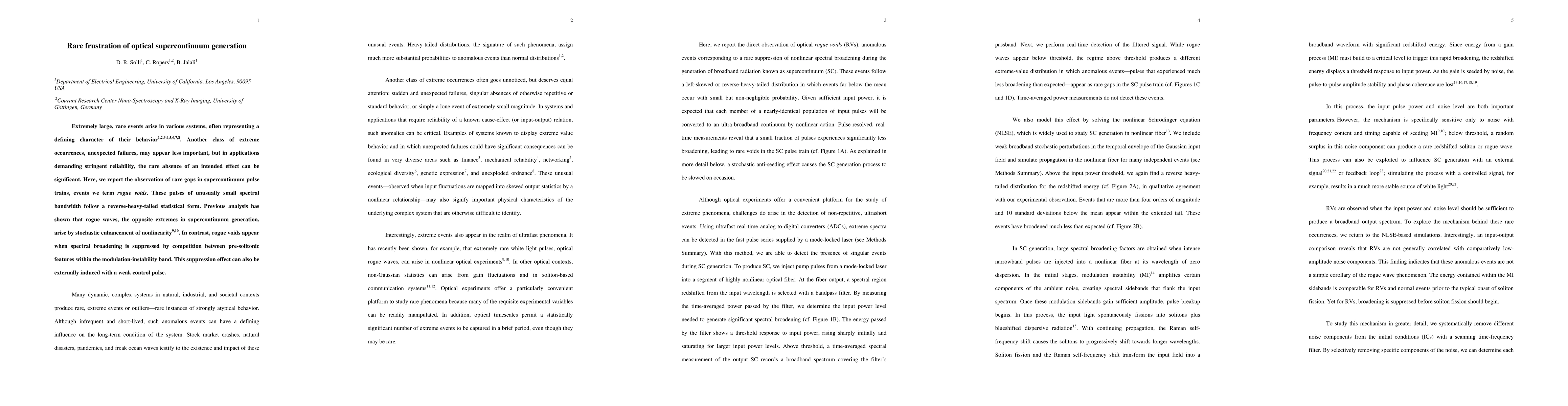 Extremely large, rare events arise in various systems, often representing a defining character of their behavior. Another class of extreme occurrences, unexpected failures, may appear less important, but in applications demanding stringent reliability, the rare absence of an intended effect can be significant. Here, we report the observation of rare gaps in supercontinuum pulse trains, events we term rogue voids. These pulses of unusually small spectral bandwidth follow a reverse-heavy-tailed statistical form. Previous analysis has shown that rogue waves, the opposite extremes in supercontinuum generation, arise by stochastic enhancement of nonlinearity. In contrast, rogue voids appear when spectral broadening is suppressed by competition between pre-solitonic features within the modulation-instability band. This suppression effect can also be externally induced with a weak control pulse.