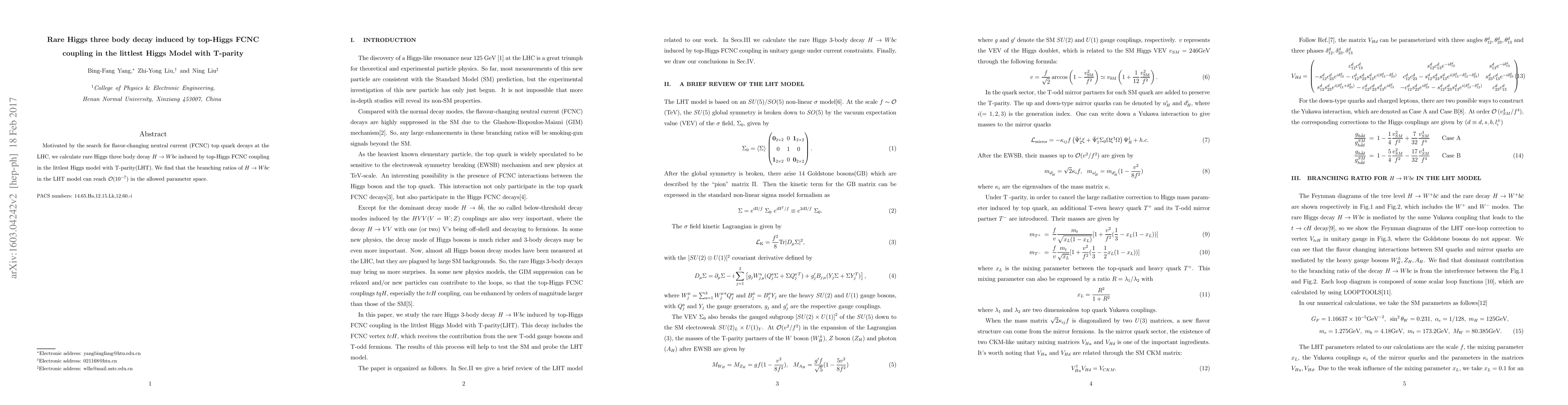Summary: This study investigates a rare Higgs three-body decay $H\rightarrow Wbc$ driven by top-Higgs FCNC coupling within the littlest Higgs model with T-parity (LHT). The branching ratio can reach $\mathcal O(10^{-7})$ in the allowed parameter space, offering potential signatures for FCNC top quark decays at the LHC.