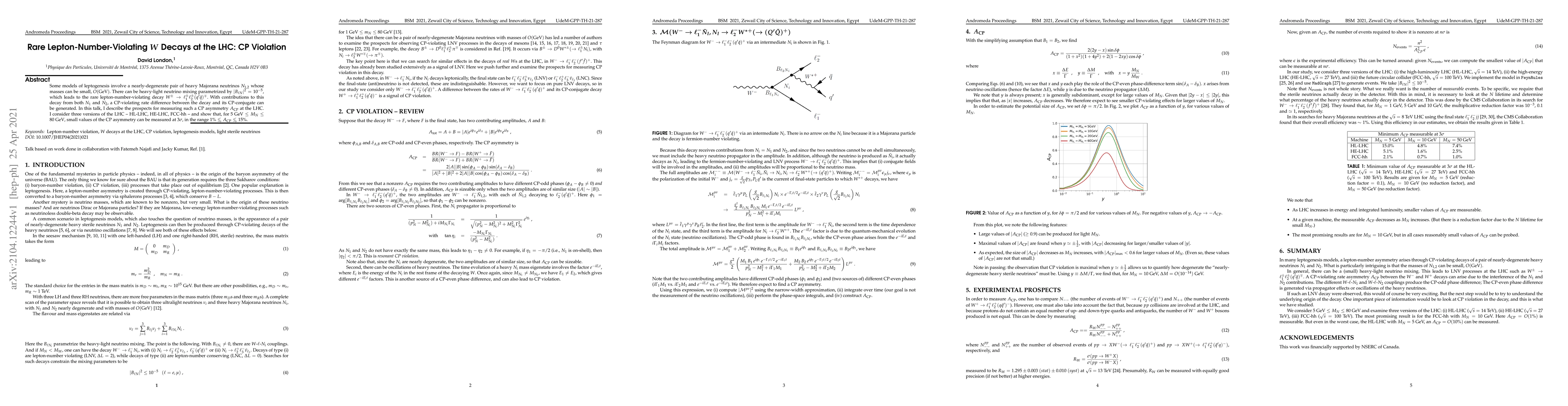 Some models of leptogenesis involve a nearly-degenerate pair of heavy Majorana neutrinos $N_{1,2}$ whose masses can be small, $O({\rm GeV})$. There can be heavy-light neutrino mixing parametrized by $|B_{\ell N}|^2 = 10^{-5}$, which leads to the rare lepton-number-violating decay $W^\pm \to \ell_1^\pm \ell_2^\pm (q'{\bar q})^\mp$. With contributions to this decay from both $N_1$ and $N_2$, a CP-violating rate difference between the decay and its CP-conjugate can be generated. In this talk, I describe the prospects for measuring such a CP asymmetry $A_{\rm CP}$ at the LHC. I consider three versions of the LHC -- HL-LHC, HE-LHC, FCC-hh -- and show that, for $5~{\rm GeV} \le M_N \le 80~{\rm GeV}$, small values of the CP asymmetry can be measured at $3\sigma$, in the range $1\%\le A_{\rm CP} \le 15\%$.