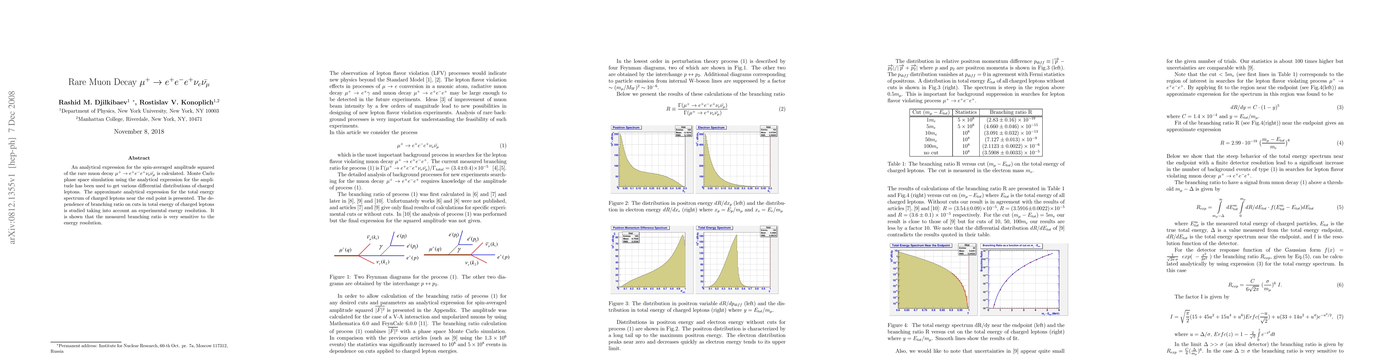 An analytical expression for the spin-averaged amplitude squared of the rare muon decay $\mu^+ \to e^+e^-e^+\nu_e\bar{\nu_\mu}$ is calculated. Monte Carlo phase space simulation using the analytical expression for the amplitude has been used to get various differential distributions of charged leptons. The approximate analytical expression for the total energy spectrum of charged leptons near the end point is presented. The dependence of branching ratio on cuts in total energy of charged leptons is studied taking into account an experimental energy resolution. It is shown that the measured branching ratio is very sensitive to the energy resolution.