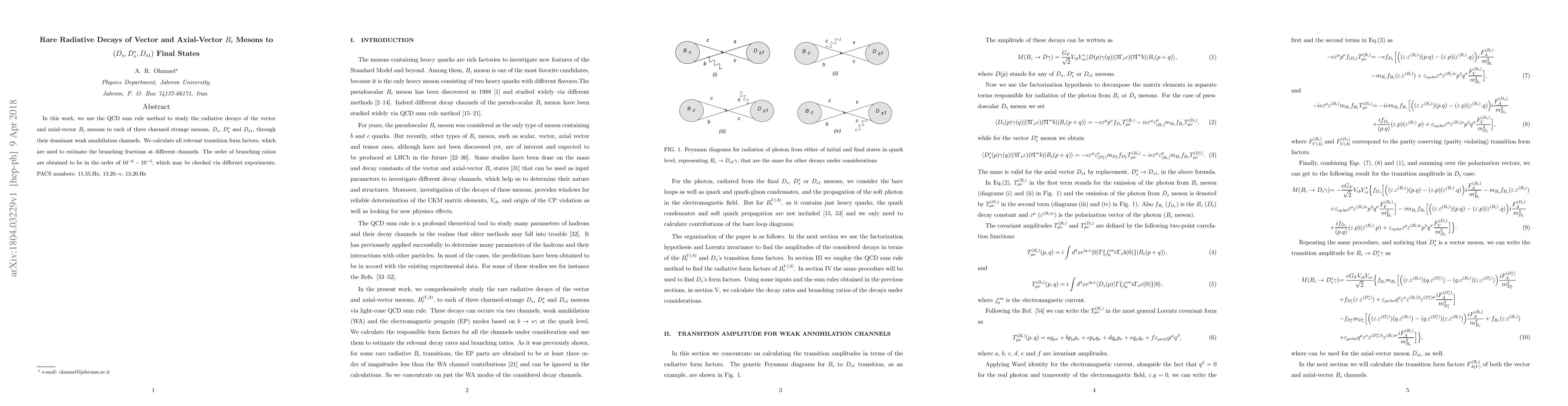In this work, we use the QCD sum rule method to study the radiative decays of the vector and axial-vector $B_c$ mesons to each of three charmed strange mesons, $D_s$, $D^*_s$ and $D_{s1}$, through their dominant weak annihilation channels. We calculate all relevant transition form factors, which are used to estimate the branching fractions at different channels. The order of branching ratios are obtained to be in the order of $ 10^{-6} - 10^{-5} $, which may be checked via differnet experiments.