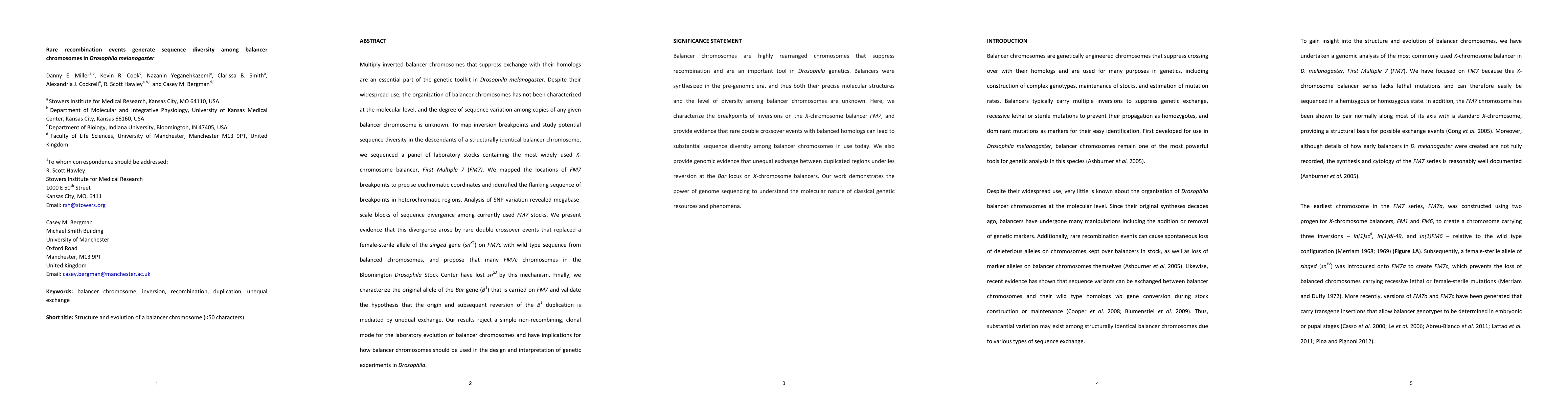 This study reveals significant sequence diversity among laboratory stocks of the widely used X-chromosome balancer FM7 in Drosophila melanogaster, driven by rare recombination events. The analysis shows that divergence likely resulted from double crossover events replacing a female-sterile allele with wild-type sequence, challenging the notion of balancer chromosomes evolving clonally.