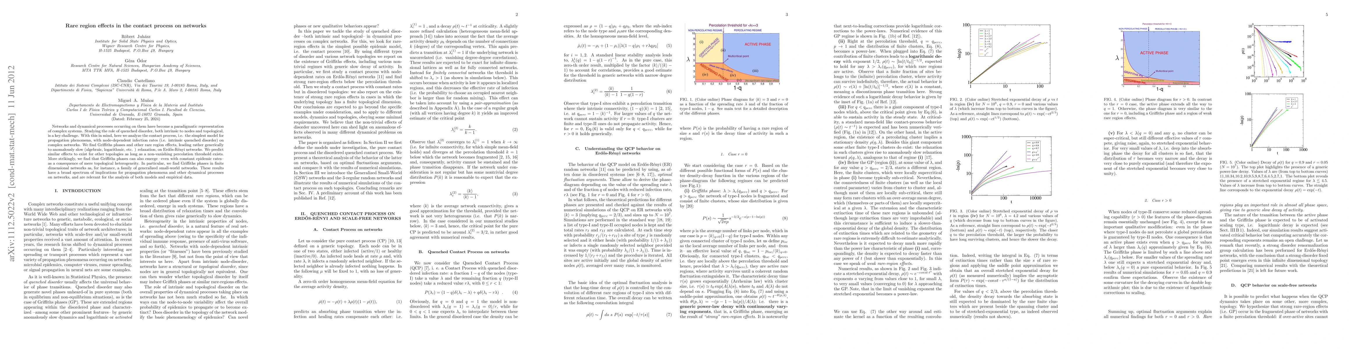 Networks and dynamical processes occurring on them have become a paradigmatic representation of complex systems. Studying the role of quenched disorder, both intrinsic to nodes and topological, is a key challenge. With this in mind, here we analyse the contact process, i.e. the simplest model for propagation phenomena, with node-dependent infection rates (i.e. intrinsic quenched disorder) on complex networks. We find Griffiths phases and other rare region effects, leading rather generically to anomalously slow (algebraic, logarithmic, etc.) relaxation, on Erd\H{o}s-R\'enyi networks. We predict similar effects to exist for other topologies as long as a non-vanishing percolation threshold exists. More strikingly, we find that Griffiths phases can also emerge --even with constant epidemic rates-- as a consequence of mere topological heterogeneity. In particular, we find Griffiths phases in finite dimensional networks as, for instance, a family of generalized small-world networks. These results have a broad spectrum of implications for propagation phenomena and other dynamical processes on networks, and are relevant for the analysis of both models and empirical data.