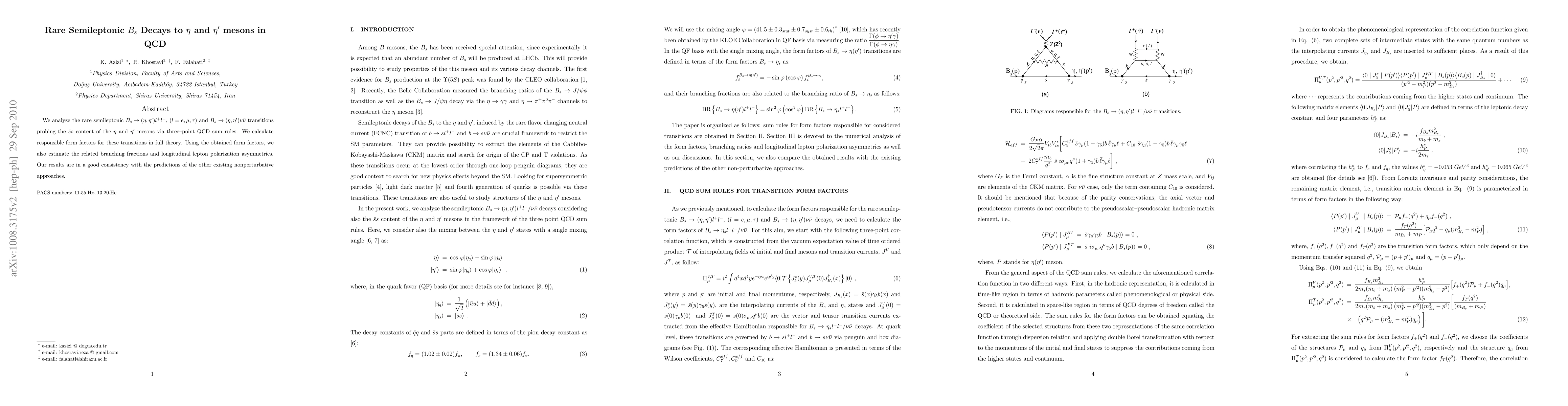 We analyze the rare semileptonic $B_s \to (\eta, \eta') l^+ l^-$, $(l=e, \mu, \tau)$ and $B_s \to (\eta, \eta') \nu \bar{\nu}$ transitions probing the $\bar s s$ content of the $\eta$ and $\eta'$ mesons via three--point QCD sum rules. We calculate responsible form factors for these transitions in full theory. Using the obtained form factors, we also estimate the related branching fractions and longitudinal lepton polarization asymmetries. Our results are in a good consistency with the predictions of the other existing nonperturbative approaches.