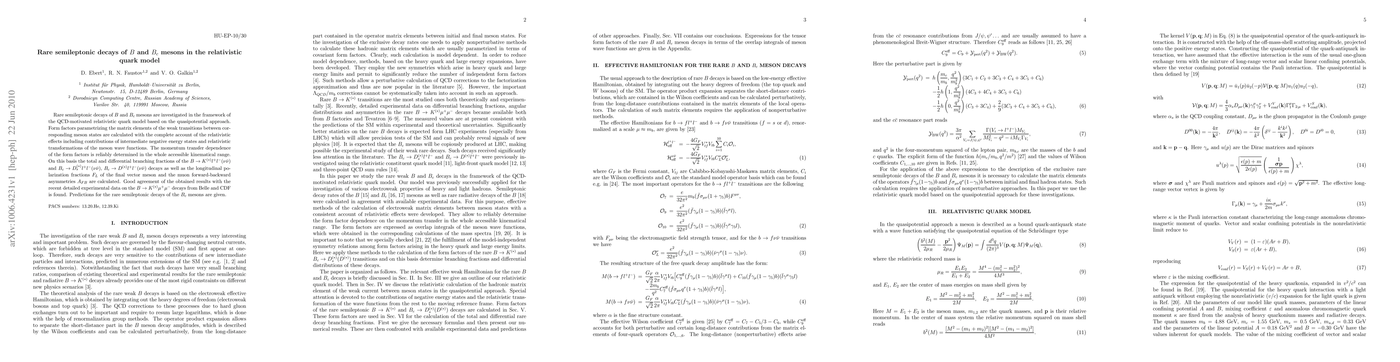 Rare semileptonic decays of B and B_c mesons are investigated in the framework of the QCD-motivated relativistic quark model based on the quasipotential approach. Form factors parametrizing the matrix elements of the weak transitions between corresponding meson states are calculated with the complete account of the relativistic effects including contributions of intermediate negative energy states and relativistic transformations of the meson wave functions. The momentum transfer dependence of the form factors is reliably determined in the whole accessible kinematical range. On this basis the total and differential branching fractions of the B\to K^{(*)}l^+l^-(\nu\bar\nu) and B_c\to D_s^{(*)}l^+l^-(\nu\bar\nu), B_c\to D^{(*)}l^+l^-(\nu\bar\nu) decays as well as the longitudinal polarization fractions F_L of the final vector meson and the muon forward-backward asymmetries A_{FB} are calculated. Good agreement of the obtained results with the recent detailed experimental data on the B\to K^{(*)}\mu^+\mu^- decays from Belle and CDF is found. Predictions for the rare semileptonic decays of the B_c mesons are given.