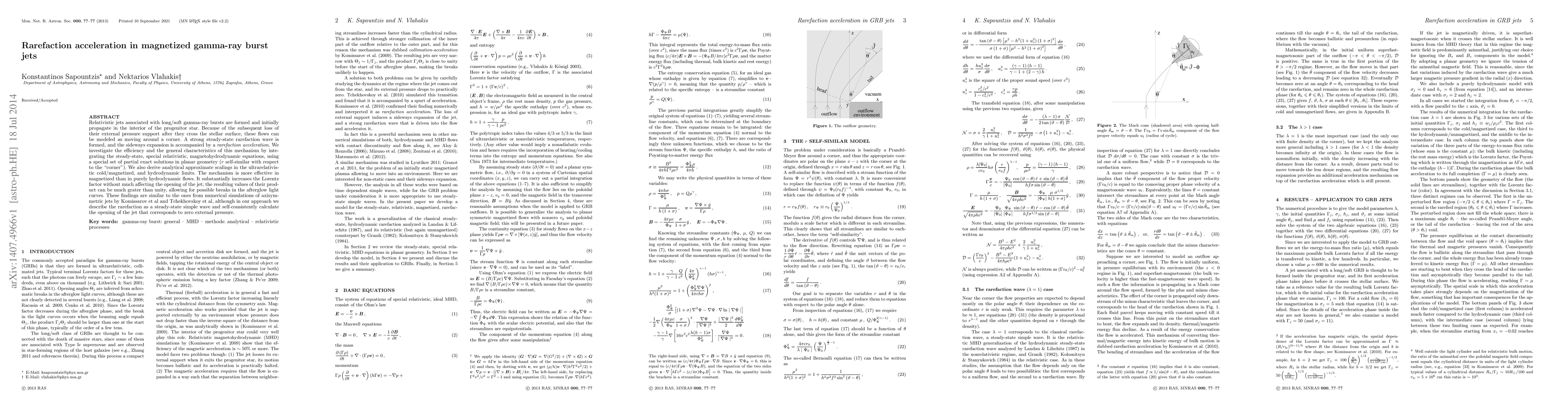 Relativistic jets associated with long/soft gamma-ray bursts are formed and initially propagate in the interior of the progenitor star. Because of the subsequent loss of their external pressure support after they cross the stellar surface, these flows can be modeled as moving around a corner. A strong steady-state rarefaction wave is formed, and the sideways expansion is accompanied by a rarefaction acceleration. We investigate the efficiency and the general characteristics of this mechanism by integrating the steady-state, special relativistic, magnetohydrodynamic equations, using a special set of partial exact solutions in planar geometry (r self-similar with respect to the "corner"). We also derive analytical approximate scalings in the ultrarelativistic cold/magnetized, and hydrodynamic limits. The mechanism is more effective in magnetized than in purely hydrodynamic flows. It substantially increases the Lorentz factor without much affecting the opening of the jet; the resulting values of their product can be much grater than unity, allowing for possible breaks in the afterglow light curves. These findings are similar to the ones from numerical simulations of axisymmetric jets by Komissarov et al and Tchekhovskoy et al, although in our approach we describe the rarefaction as a steady-state simple wave and self-consistently calculate the opening of the jet that corresponds to zero external pressure.