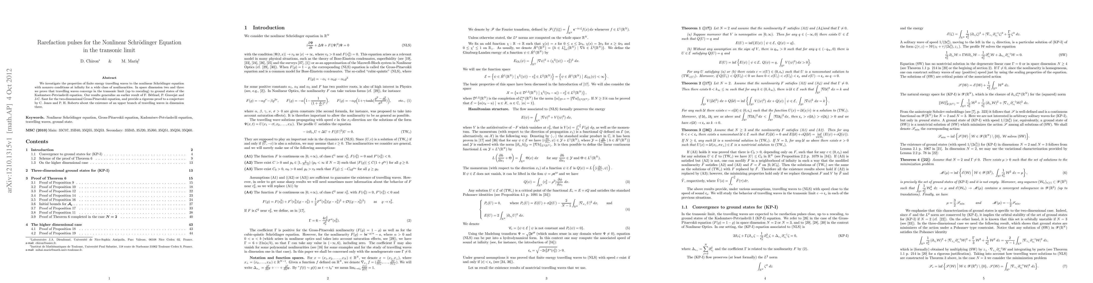 We investigate the properties of finite energy travelling waves to the nonlinear Schrodinger equation with nonzero conditions at infinity for a wide class of nonlinearities. In space dimension two and three we prove that travelling waves converge in the transonic limit (up to rescaling) to ground states of the Kadomtsev-Petviashvili equation. Our results generalize an earlier result of F. Bethuel, P. Gravejat and J-C. Saut for the two-dimensional Gross-Pitaevskii equation, and provide a rigorous proof to a conjecture by C. Jones and P. H. Roberts about the existence of an upper branch of travelling waves in dimension three.
