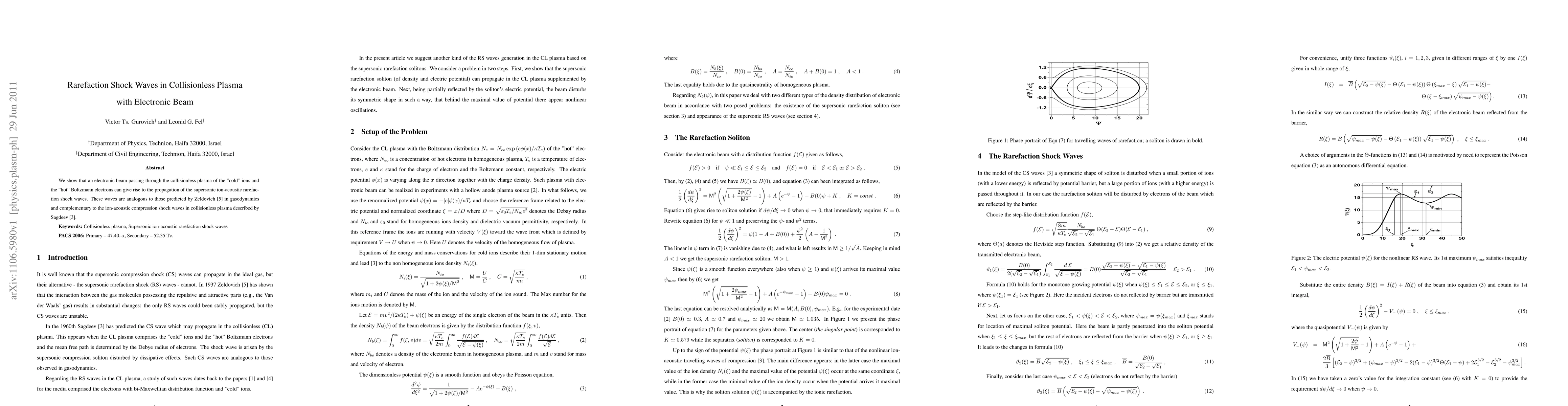 We show that an electronic beam passing through the collisionless plasma of the "cold" ions and the "hot" Boltzmann electrons can give rise to the propagation of the supersonic ion-acoustic rarefaction shock waves. These waves are analogous to those predicted by Zeldovich [5] in gasodynamics and complementary to the ion-acoustic compression shock waves in collisionless plasma described by Sagdeev [3].