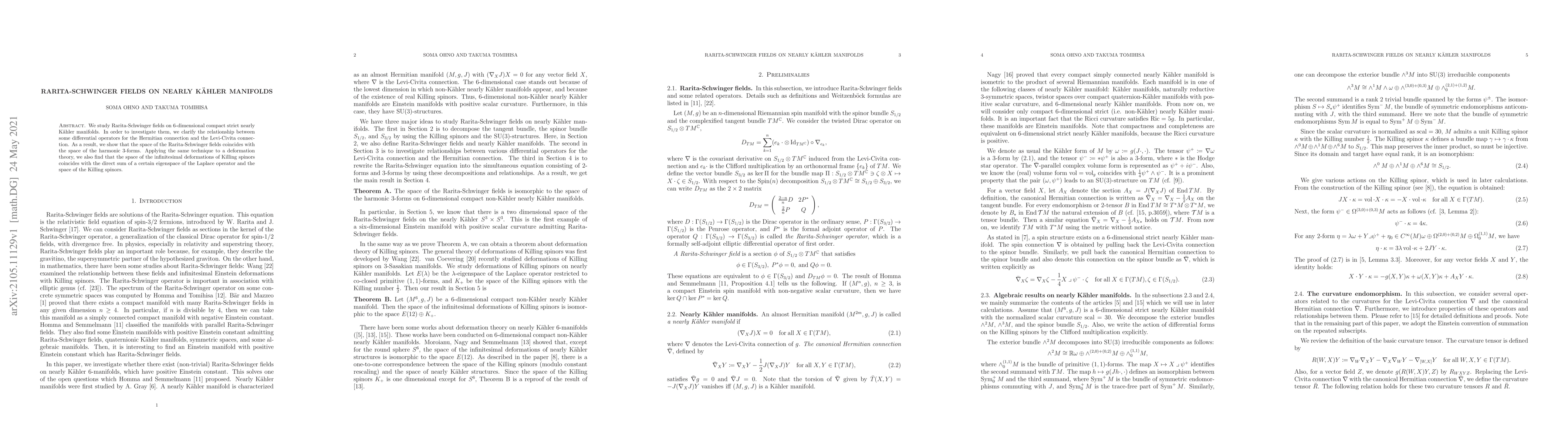 This paper investigates Rarita-Schwinger fields on 6-dimensional compact strict nearly Kähler manifolds, establishing their equivalence to harmonic 3-forms. It also explores the deformation theory of Killing spinors, showing their infinitesimal deformations relate to a specific eigenspace of the Laplace operator.