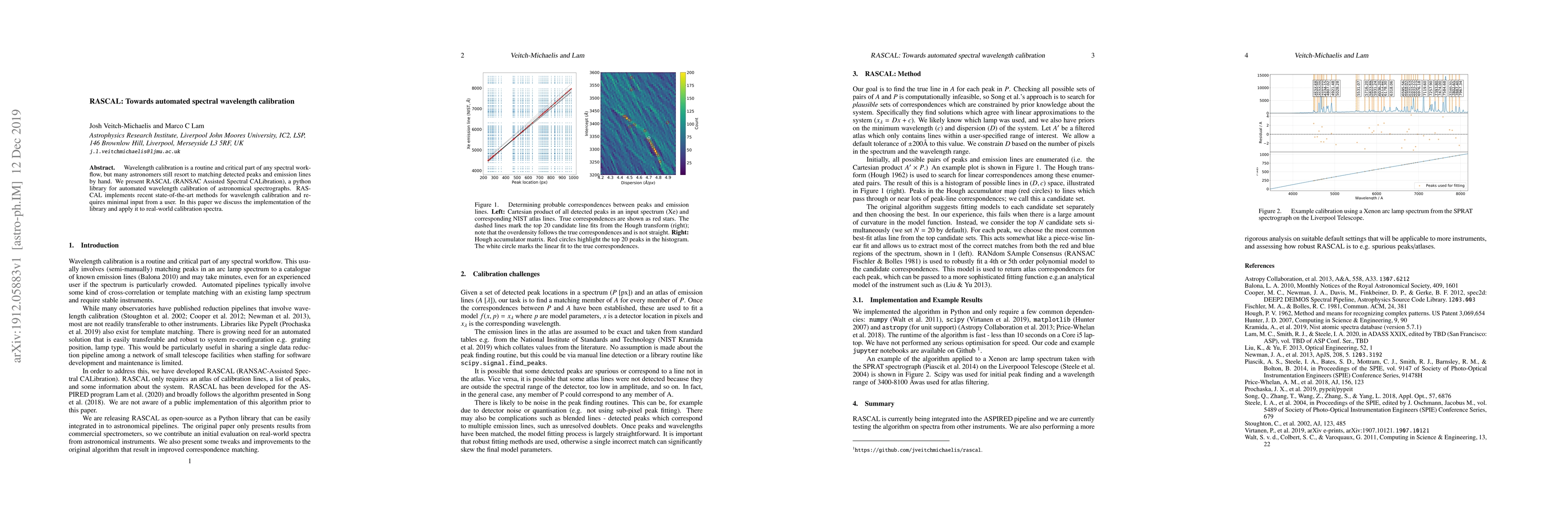 RASCAL is a Python library for automated wavelength calibration of astronomical spectrographs, utilizing RANSAC for precise calibration. The authors demonstrate its effectiveness by applying it to real-world calibration spectra, reducing the need for manual peak matching.