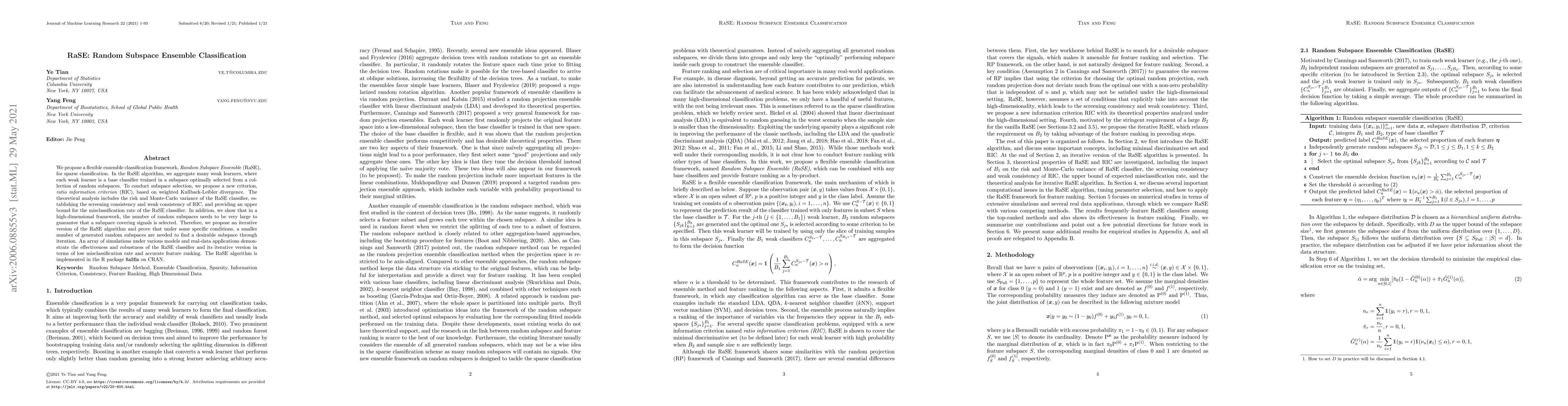 The RaSE algorithm is a flexible ensemble classification framework for sparse data, utilizing weak learners trained on optimally selected random subspaces. It employs a new ratio information criterion (RIC) for subspace selection and demonstrates effectiveness through simulations and real-data applications, with an iterative version reducing the number of required subspaces.