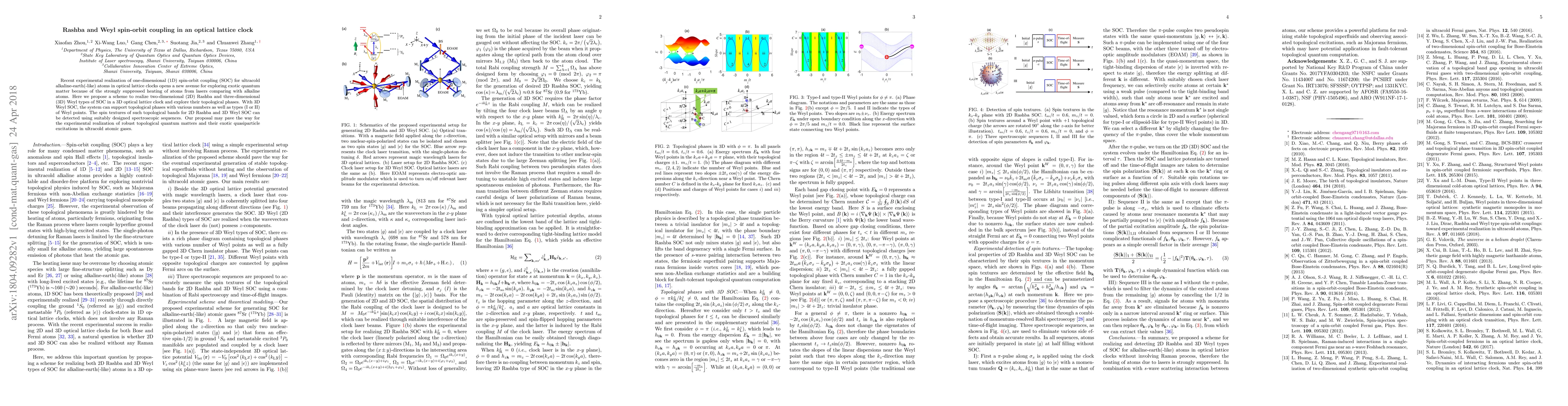 This paper proposes a scheme to realize two-dimensional Rashba and three-dimensional Weyl spin-orbit coupling in a 3D optical lattice clock using ultracold alkaline-earth atoms. The study explores topological phases supported by these couplings, potentially enabling the detection of exotic quasiparticle excitations and paving the way for robust topological quantum matter experiments.