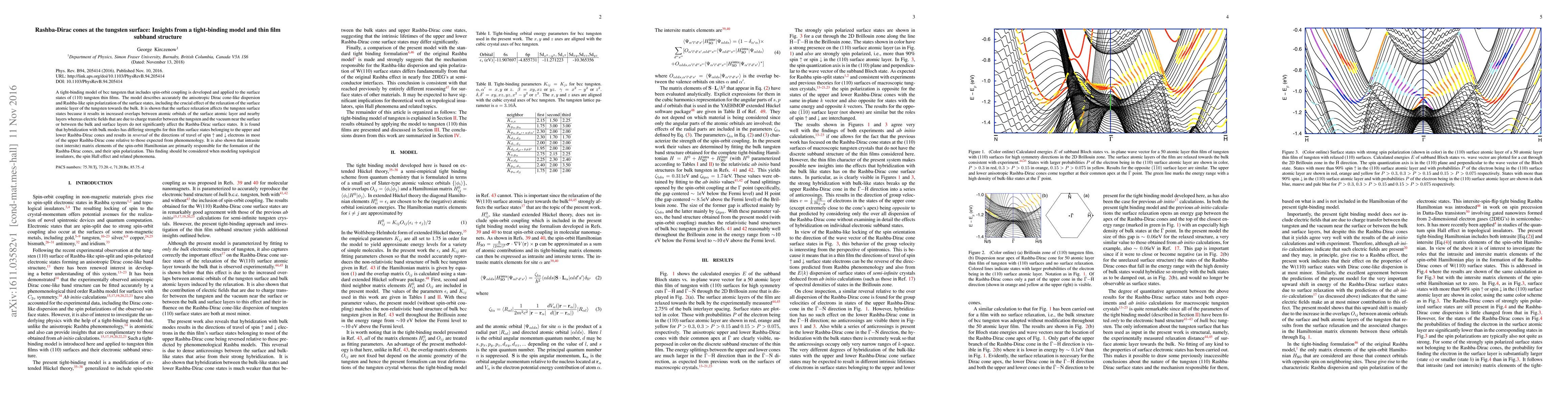A tight-binding model of bcc tungsten that includes spin-orbit coupling is developed and applied to the surface states of (110) tungsten thin films. The model describes accurately the anisotropic Dirac cone-like dispersion and Rashba-like spin polarization of the surface states, including the crucial effect of the relaxation of the surface atomic layer of the tungsten towards the bulk. It is shown that the surface relaxation affects the tungsten surface states because it results in increased overlaps between atomic orbitals of the surface atomic layer and nearby layers whereas electric fields that are due to charge transfer between the tungsten and the vacuum near the surface or between the bulk and surface layers do not significantly affect the Rashba-Dirac surface states. It is found that hybridization with bulk modes has differing strengths for thin film surface states belonging to the upper and lower Rashba-Dirac cones and results in $reversal$ of the directions of travel of spin $\uparrow$ and $\downarrow$ electrons in most of the upper Rashba-Dirac cone relative to those expected from phenomenology. It is also shown that intrasite (not intersite) matrix elements of the spin-orbit Hamiltonian are primarily responsible for the formation of the Rashba-Dirac cones, and their spin polarization. This finding should be considered when modeling topological insulators, the spin Hall effect and related phenomena.