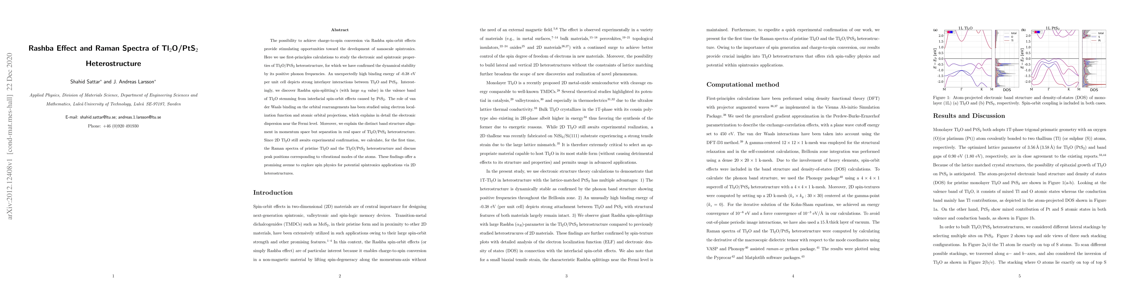 The possibility to achieve charge-to-spin conversion via Rashba spin-orbit effects provide stimulating opportunities toward the development of nanoscale spintronics. Here we use first-principles calculations to study the electronic and spintronic properties of Tl$_2$O/PtS$_2$ heterostructure, for which we have confirmed the dynamical stability by its positive phonon frequencies. An unexpectedly high binding energy of -0.38 eV per unit cell depicts strong interlayer interactions between Tl$_2$O and PtS$_2$. Interestingly, we discover Rashba spin-splitting's (with large $\alpha_R$ value) in the valence band of Tl$_2$O stemming from interfacial spin-orbit effects caused by PtS$_2$. The role of van der Waals binding on the orbital rearrangements has been studied using electron localization function and atomic orbital projections, which explains in detail the electronic dispersion near the Fermi level. Moreover, we explain the distinct band structure alignment in momentum space but separation in real space of Tl$_2$O/PtS$_2$ heterostructure. Since 2D Tl$_2$O still awaits experimental confirmation, we calculate, for the first time, the Raman spectra of pristine Tl$_2$O and the Tl$_2$O/PtS$_2$ heterostructure and discuss peak positions corresponding to vibrational modes of the atoms. These findings offer a promising avenue to explore spin physics for potential spintronics applications via 2D heterostructures.