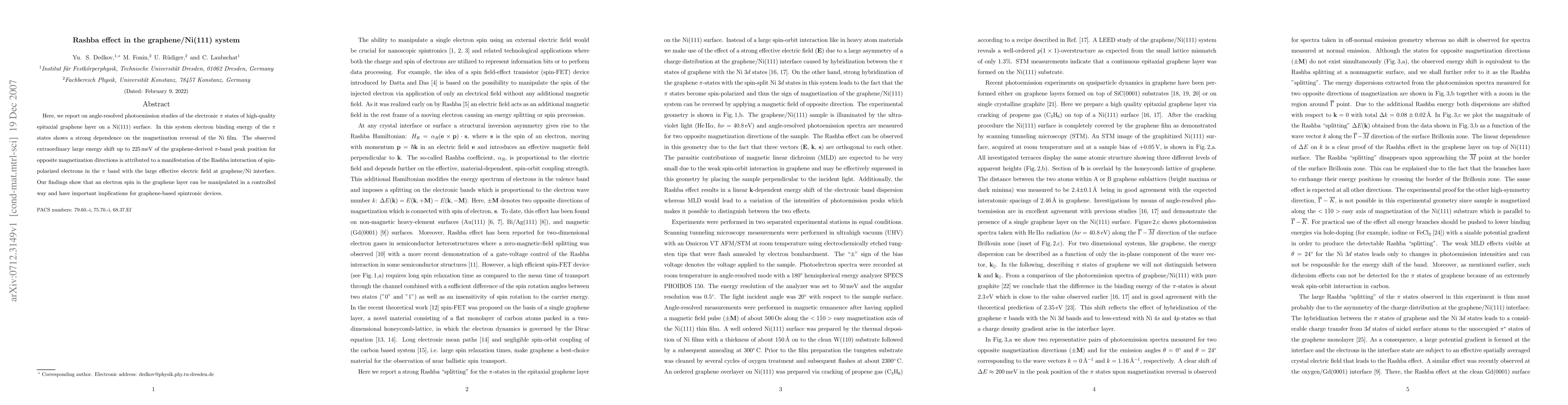 This study reveals a significant Rashba effect in graphene on a Ni(111) surface, demonstrated by a large 225 meV energy shift in the $\pi$ band due to spin-polarized electrons interacting with the interface's electric field, suggesting potential for spintronic applications.