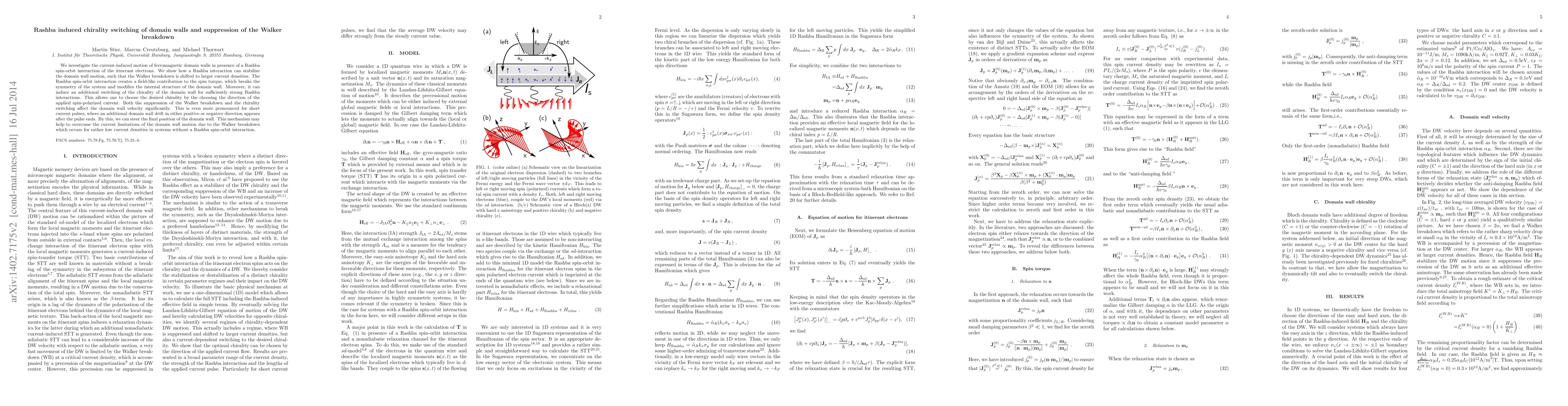 Summary: Rashba interaction stabilizes domain wall dynamics by shifting the Walker breakdown to higher current densities, and induces chirality switching that can be controlled by current direction, significantly affecting domain wall velocity, especially after short current pulses.