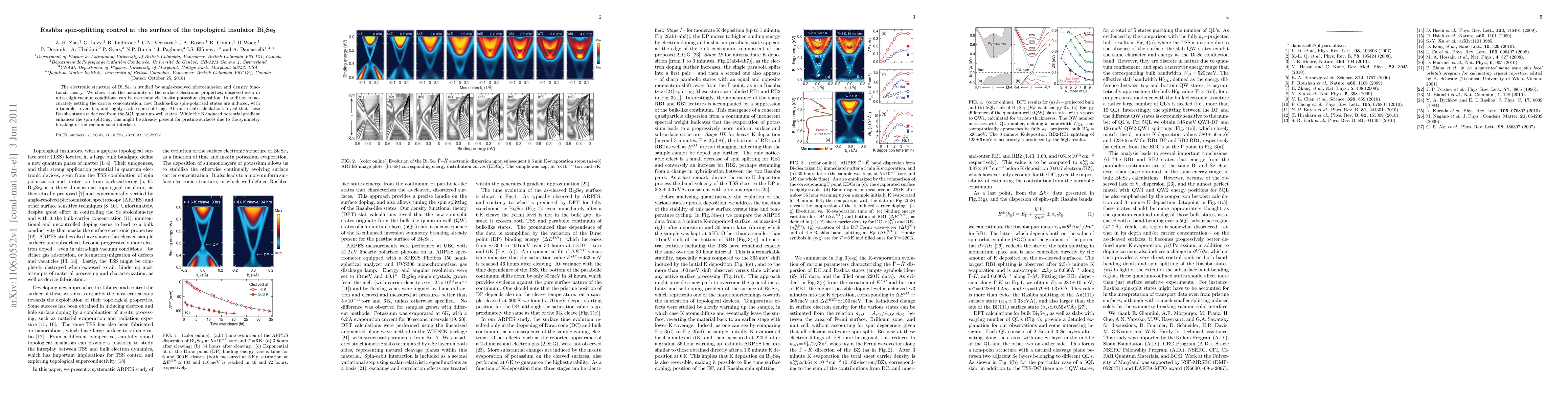 The electronic structure of Bi2Se3 is studied by angle-resolved photoemission and density functional theory. We show that the instability of the surface electronic properties, observed even in ultra-high-vacuum conditions, can be overcome via in-situ potassium deposition. In addition to accurately setting the carrier concentration, new Rashba-like spin-polarized states are induced, with a tunable, reversible, and highly stable spin splitting. Ab-initio slab calculations reveal that these Rashba state are derived from the 5QL quantum-well states. While the K-induced potential gradient enhances the spin splitting, this might be already present for pristine surfaces due to the symmetry breaking of the vacuum-solid interface.