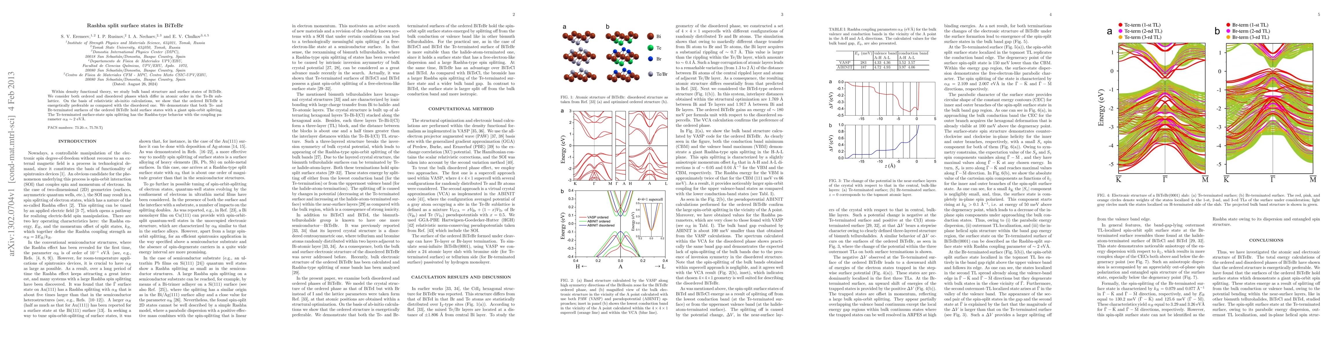 This study uses density functional theory to investigate the bulk and surface states of BiTeBr, showing that the ordered phase is more stable. The ordered BiTeBr exhibits significant Rashba-type spin-orbit splitting on both Te- and Br-terminated surfaces, with the Te-terminated surface displaying a giant spin splitting characterized by a coupling parameter of approximately 2 eV Å.