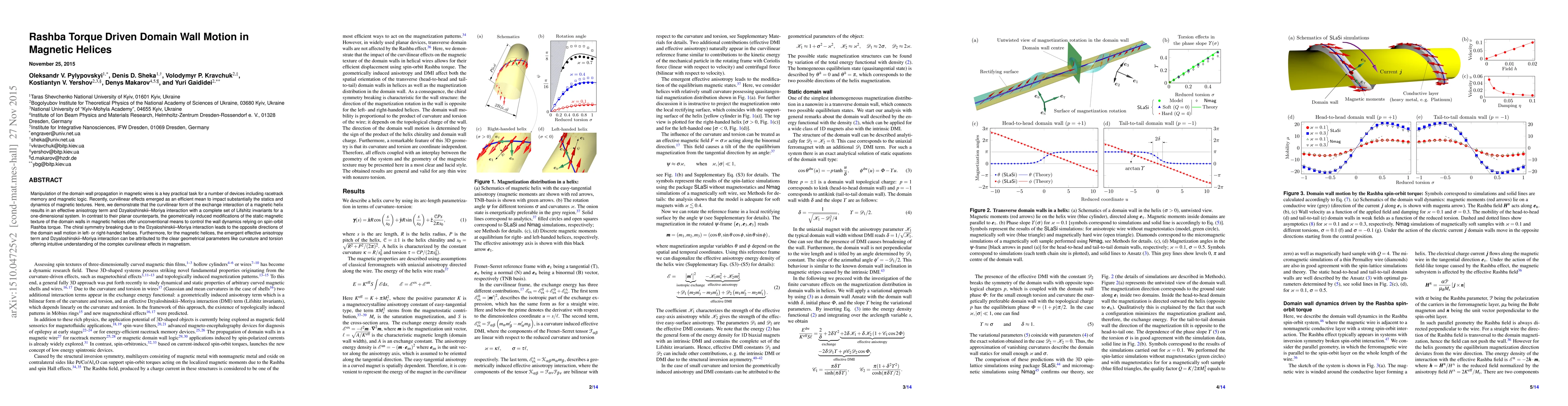 This paper demonstrates that the curvilinear geometry of magnetic helices induces unique anisotropy and Dzyaloshinskii-Moriya interactions, enabling control of domain wall motion via Rashba torque, with opposite domain wall propagation directions in left- and right-handed helices due to chiral symmetry breaking.