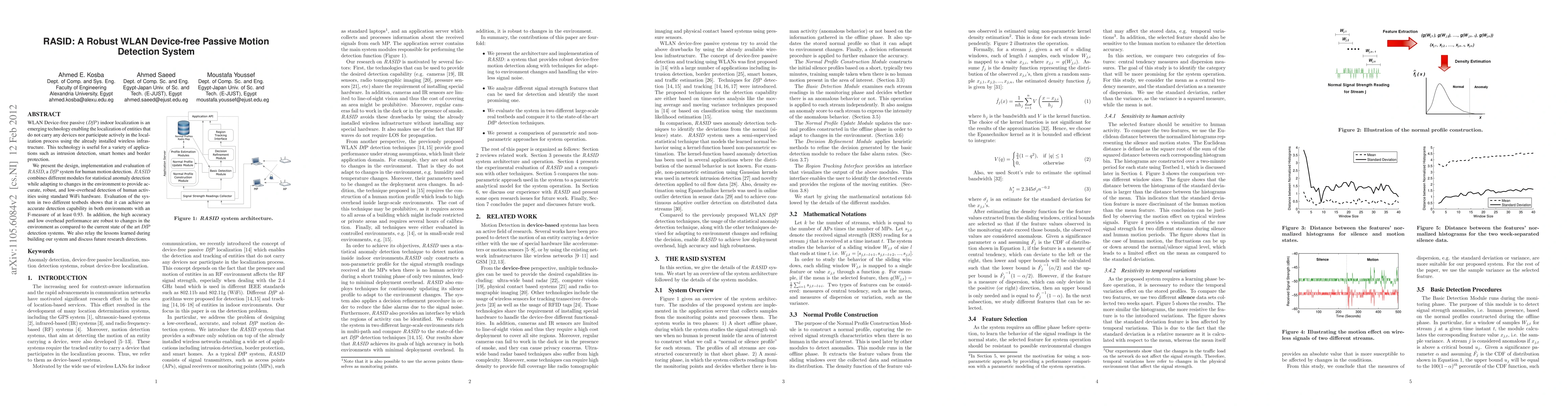 WLAN Device-free passive DfP indoor localization is an emerging technology enabling the localization of entities that do not carry any devices nor participate actively in the localization process using the already installed wireless infrastructure. This technology is useful for a variety of applications such as intrusion detection, smart homes and border protection. We present the design, implementation and evaluation of RASID, a DfP system for human motion detection. RASID combines different modules for statistical anomaly detection while adapting to changes in the environment to provide accurate, robust, and low-overhead detection of human activities using standard WiFi hardware. Evaluation of the system in two different testbeds shows that it can achieve an accurate detection capability in both environments with an F-measure of at least 0.93. In addition, the high accuracy and low overhead performance are robust to changes in the environment as compared to the current state of the art DfP detection systems. We also relay the lessons learned during building our system and discuss future research directions.
