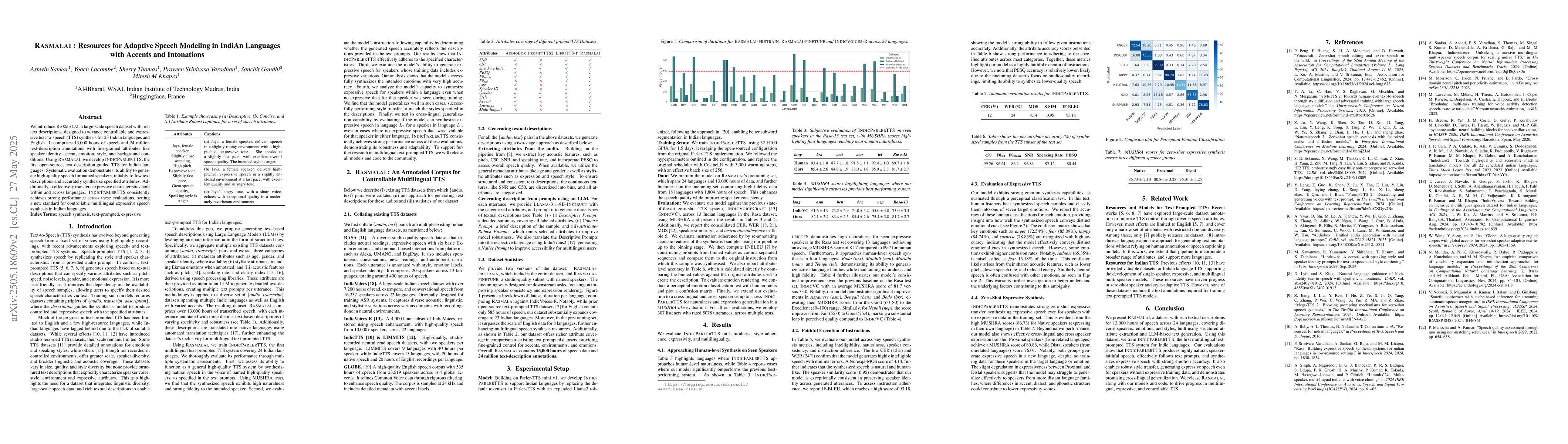 RASMALAI dataset and IndicParlerTTS, the first open-source TTS for Indian languages guided by text descriptions.