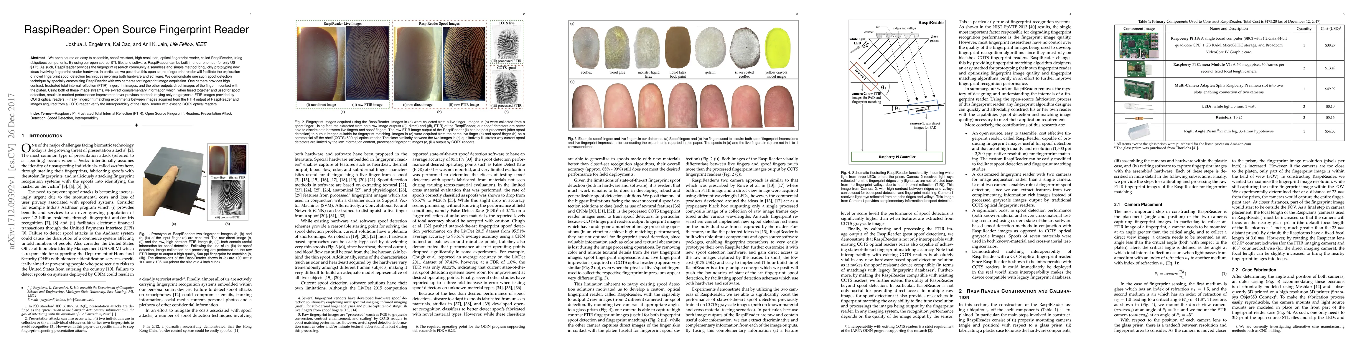 The paper introduces RaspiReader, an open-source, low-cost fingerprint reader built with common components, costing $175 and taking less than an hour to assemble. It uses two cameras for high-resolution imaging, combining frustrated total internal reflection (FTIR) and direct finger images for enhanced spoof detection. This reader improves upon existing methods and is interoperable with commercial off-the-shelf (COTS) readers, aiding research in fingerprint technology.