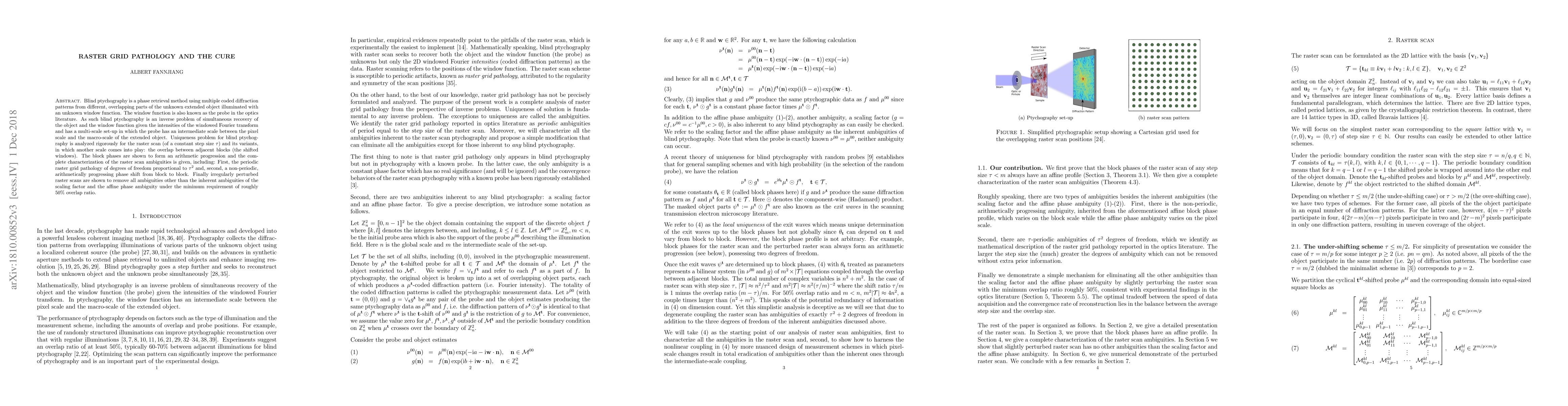 Blind ptychography is a phase retrieval method using multiple coded diffraction patterns from different, overlapping parts of the unknown extended object illuminated with an unknown window function. The window function is also known as the probe in the optics literature. As such blind ptychography is an inverse problem of simultaneous recovery of the object and the window function given the intensities of the windowed Fourier transform and has a multi-scale set-up in which the probe has an intermediate scale between the pixel scale and the macro-scale of the extended object. Uniqueness problem for blind ptychography is analyzed rigorously for the raster scan (of a constant step size {\tau}) and its variants, in which another scale comes into play: the overlap between adjacent blocks (the shifted windows). The block phases are shown to form an arithmetic progression and the complete characterization of the raster scan ambiguities is given, including: First, the periodic raster grid pathology of degrees of freedom proportional to {\tau}^2 and, second, a non-periodic, arithmetically progressing phase shift from block to block. Finally irregularly perturbed raster scans are shown to remove all ambiguities other than the inherent ambiguities of the scaling factor and the affine phase ambiguity under the minimum requirement of roughly 50% overlap ratio.