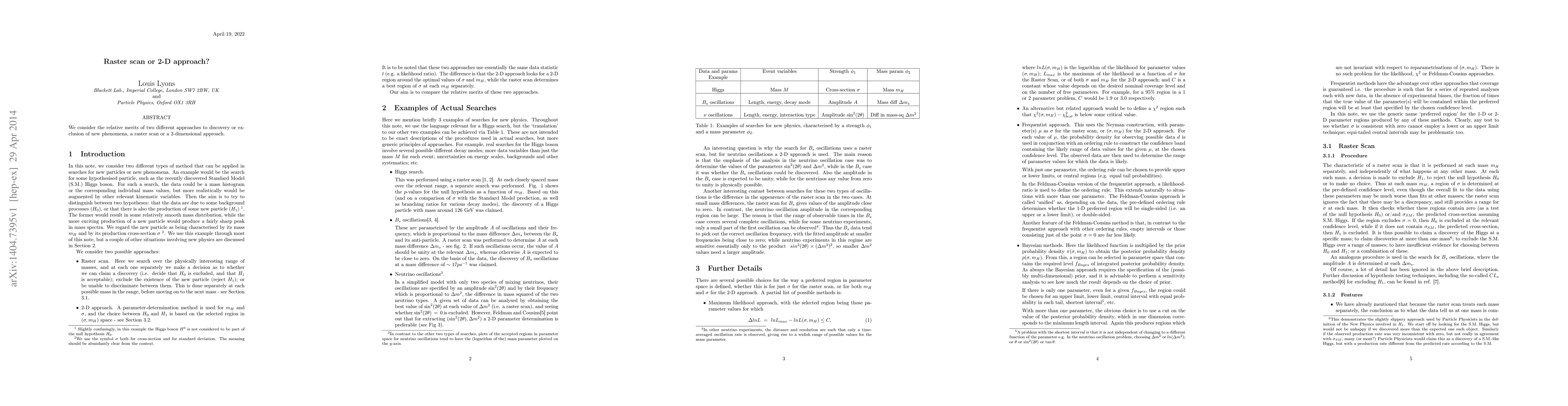 A study compares two approaches to discovering new phenomena: a raster scan, which systematically covers a space, and a 2D approach, which focuses on specific regions. The paper aims to determine the most effective method for discovery or exclusion.