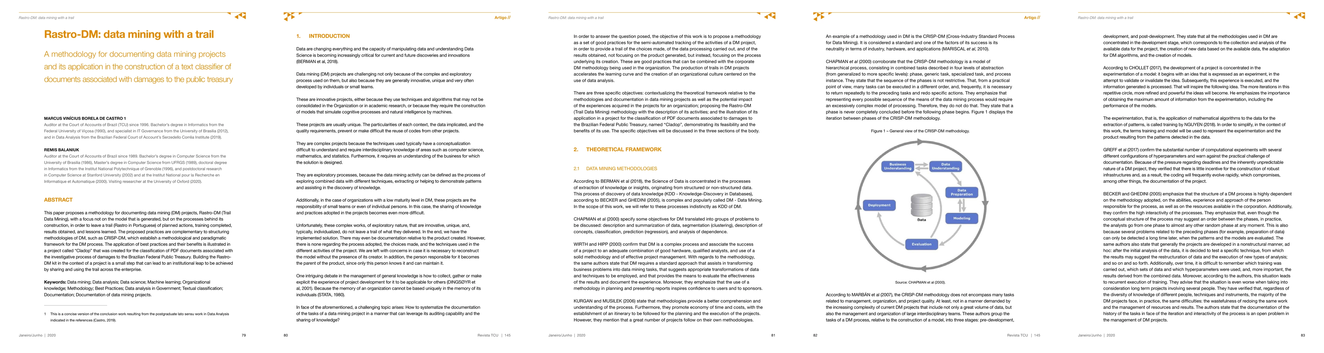 This paper introduces Rastro-DM, a methodology for documenting data mining projects by focusing on the processes rather than the final model, aiming to create a comprehensive trail of actions, training, results, and lessons learned. The approach complements existing DM frameworks like CRISP-DM and is demonstrated through a project classifying investigative PDF documents for Brazilian Federal Public Treasury.