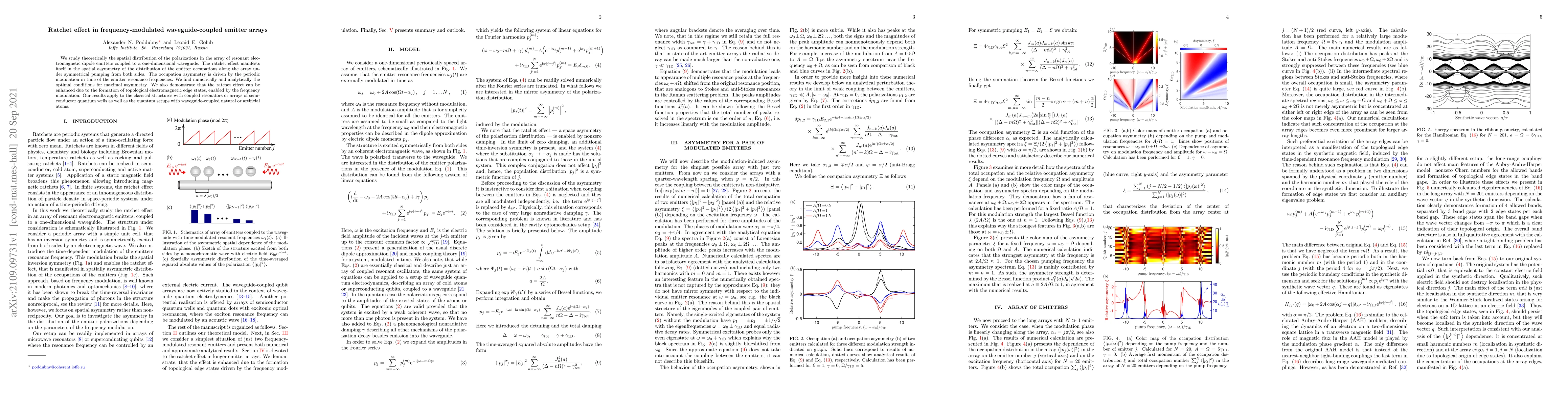 This paper explores the ratchet effect in waveguide-coupled emitter arrays, revealing spatial asymmetry in emitter occupations due to time-modulated resonance frequencies. The study identifies optimal conditions for maximal asymmetry and shows that topological edge states can enhance this effect.