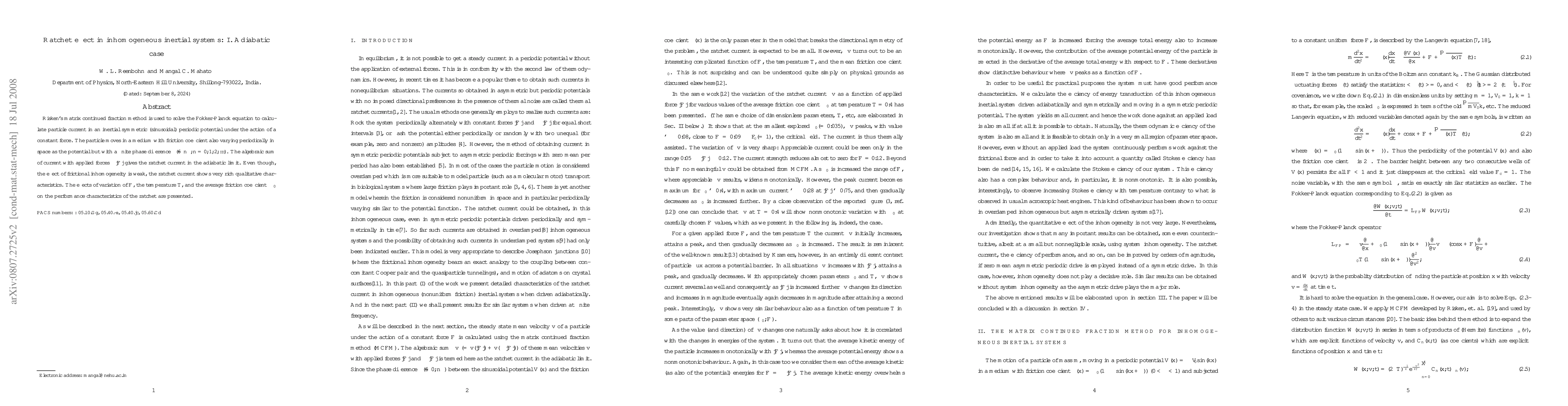 Risken's matrix continued fraction method is used to solve the Fokker-Planck equation to calculate particle current in an inertial symmetric (sinusoidal) periodic potential under the action of a constant force. The particle moves in a medium with friction coefficient also varying periodically in space as the potential but with a finite phase difference $\phi (\ne n\pi, n=0,1,2, ...)$. The algebraic sum of current with applied forces $\pm|F|$ gives the ratchet current in the adiabatic limit. Even though, the effect of frictional inhomogeneity is weak, the ratchet current shows very rich qualitative characteristics. The effects of variation of $F$, the temperature $T$, and the average friction coefficient $\gamma_0$ on the performance characteristics of the ratchet are presented.