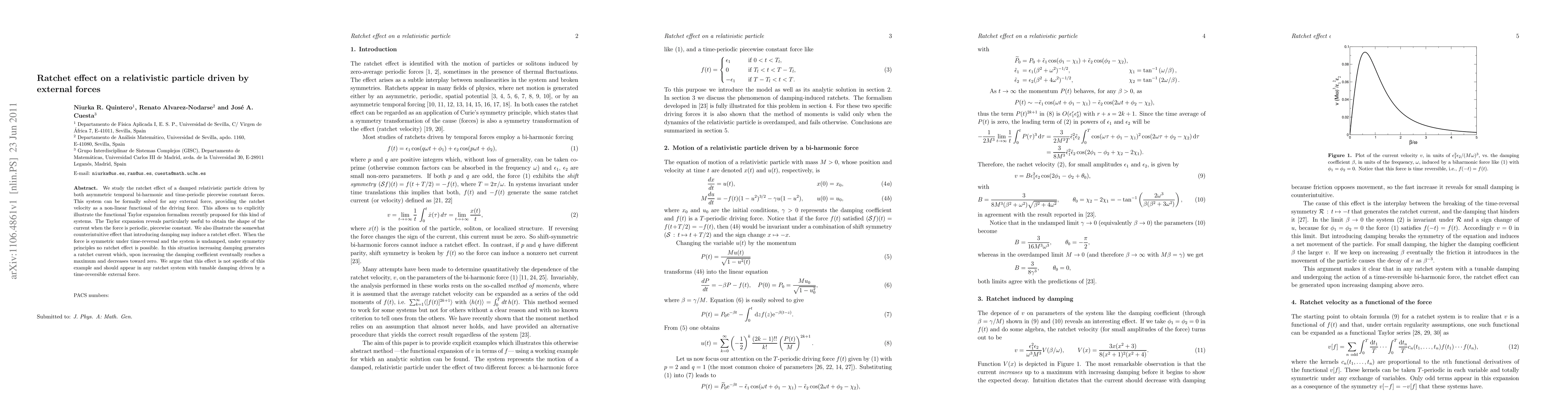 This paper explores the ratchet effect on a relativistic particle subjected to asymmetric temporal bi-harmonic and time-periodic piecewise constant forces, revealing that damping can induce a ratchet current even when the force is time-reversible. The study utilizes a Taylor expansion to analyze the current shape and demonstrates that increasing damping can initially enhance but eventually diminish the ratchet effect.