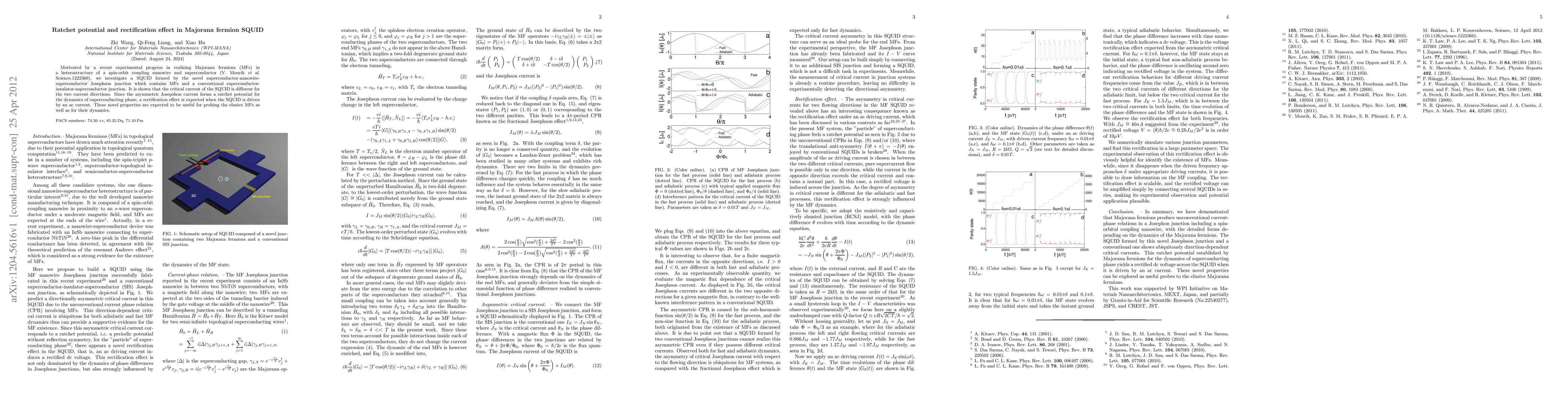 This paper investigates a SQUID incorporating Majorana fermions in a superconductor-nanowire-superconductor junction, revealing a rectification effect due to asymmetric Josephson current and a ratchet potential for superconducting phase dynamics. These findings could aid in probing Majorana fermions and understanding their dynamics.