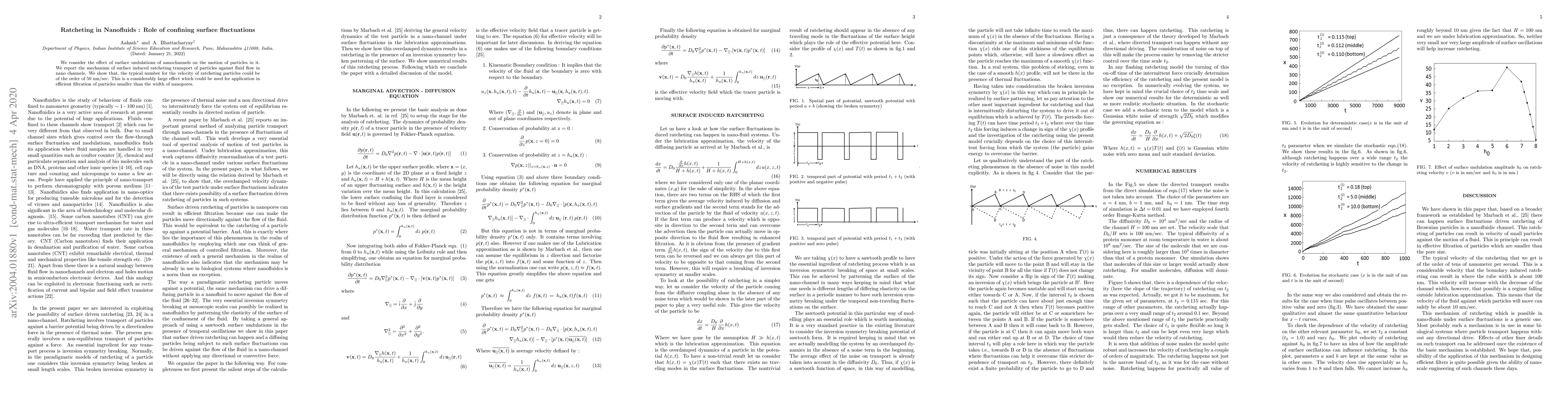 Summary: The study investigates how surface undulations in nanochannels induce ratcheting transport of particles against fluid flow, achieving velocities up to 50 nm/sec. This phenomenon could enhance filtration efficiency for particles smaller than nanopore widths.