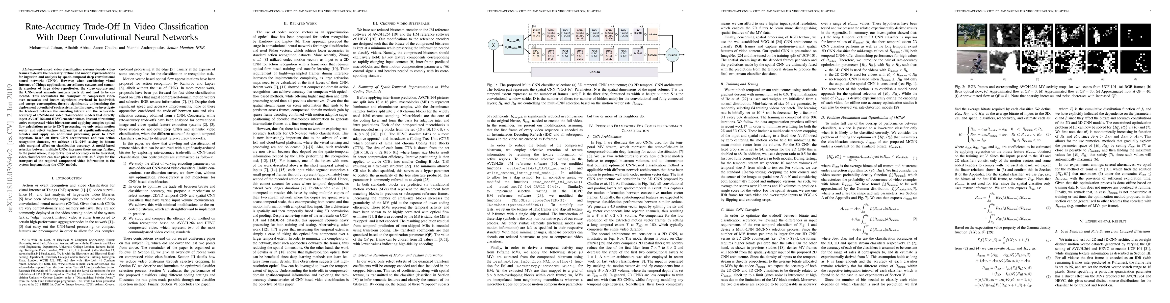 This paper explores the trade-off between encoding bitrate and accuracy in CNN-based video classification, demonstrating that significant bitrate reductions (11%-94%) can be achieved with minimal loss in classification accuracy. By selectively retaining motion vector and texture information at reduced bitrates, the study shows that video classification can function effectively with as little as 3 kbps, provided a tolerable 7% loss in accuracy.