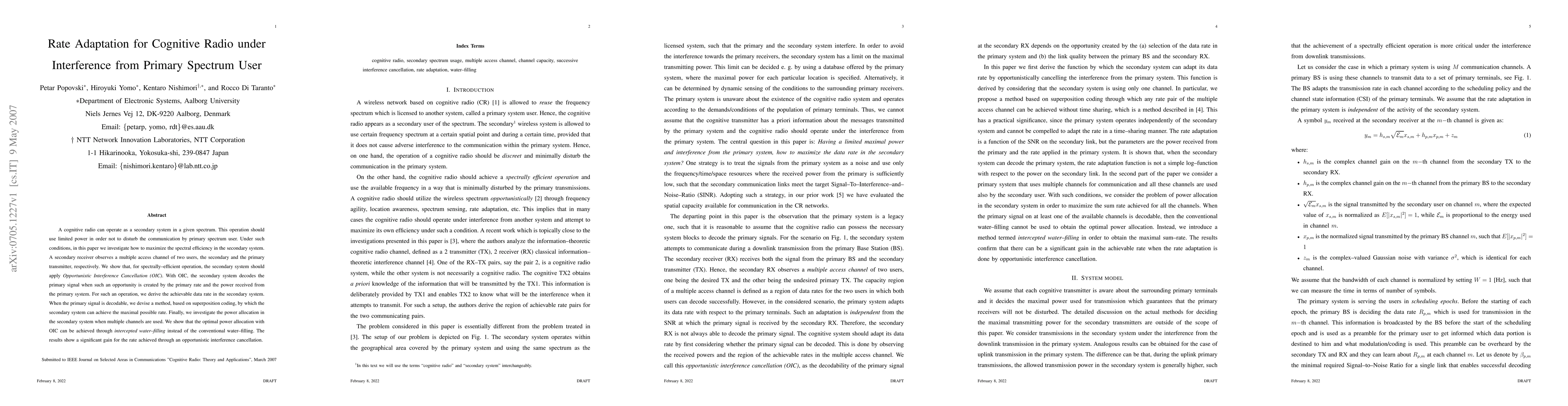 This paper explores maximizing spectral efficiency for a cognitive radio operating under interference from primary spectrum users. It proposes Opportunistic Interference Cancellation (OIC) to decode primary signals and achieve maximal data rates through superposition coding, while optimizing power allocation via intercepted water-filling.