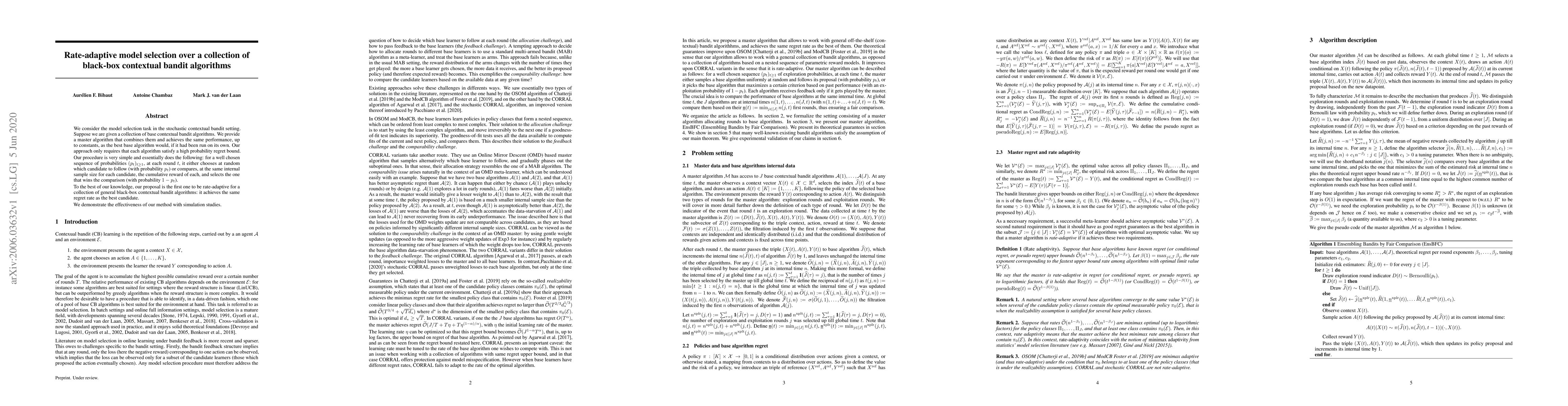 This paper proposes a rate-adaptive master algorithm for selecting among a collection of contextual bandit algorithms, achieving the same performance as the best individual algorithm. The algorithm combines base algorithms through a simple process that alternates between random selection and cumulative reward comparison.