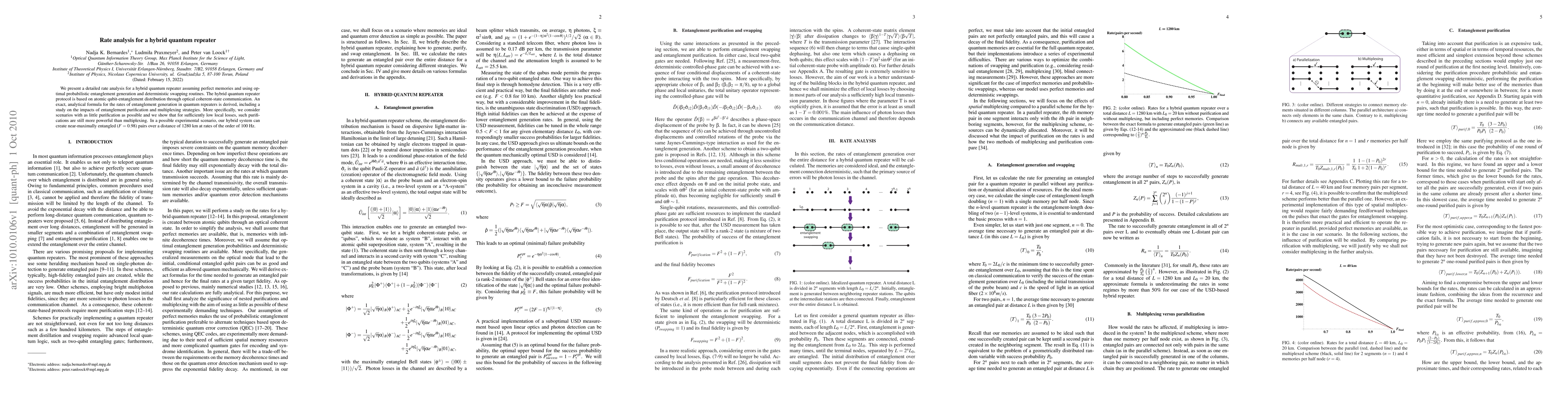 This paper presents a rate analysis for a hybrid quantum repeater that uses atomic qubit-entanglement distribution via optical communication. The study derives an analytical formula for entanglement generation rates, demonstrating that minimal purification is more effective than multiplexing under low local losses, achieving near-maximal entanglement over 1280 km at rates of 100 Hz.