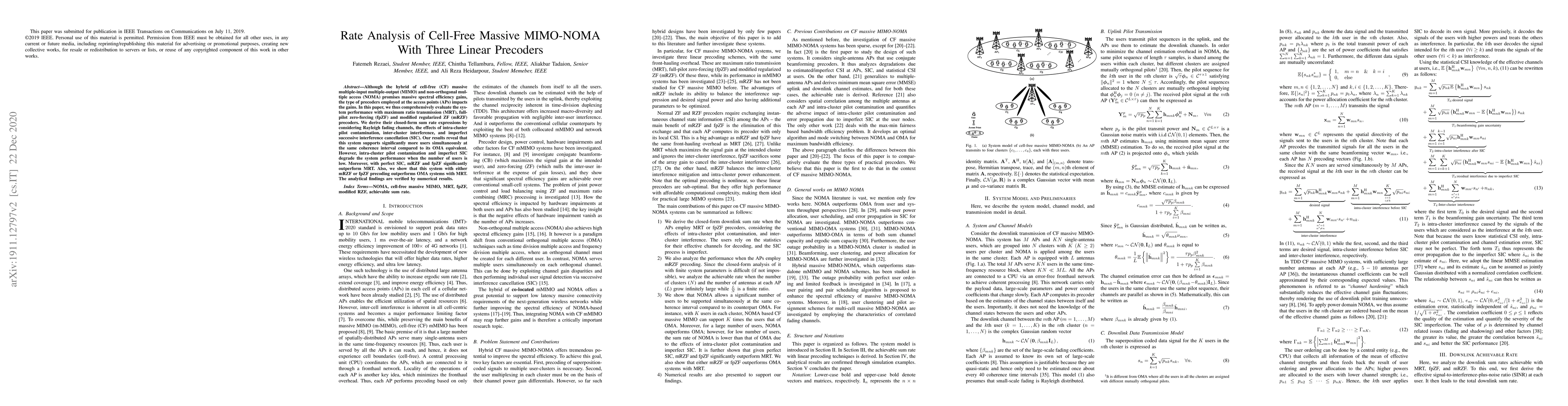 This paper analyzes the rate performance of cell-free massive MIMO-NOMA using three linear precoders: MRT, fpZF, and mRZF. It finds that mRZF and fpZF outperform MRT under perfect SIC, while intra-cluster pilot contamination and imperfect SIC degrade performance for low user counts.