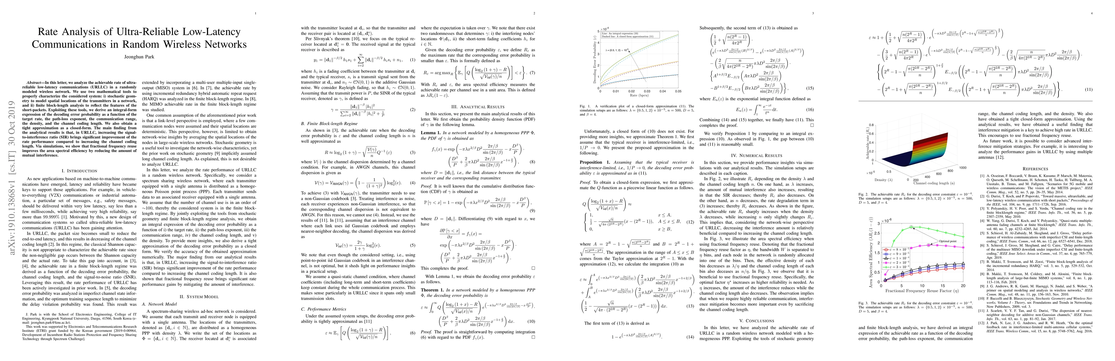 This paper analyzes the achievable rate of ultra-reliable low-latency communications in random wireless networks using stochastic geometry and finite block-length analysis. The study finds that enhancing signal-to-interference ratio significantly improves rate performance over increasing channel coding length, and fractional frequency reuse boosts area spectral efficiency.