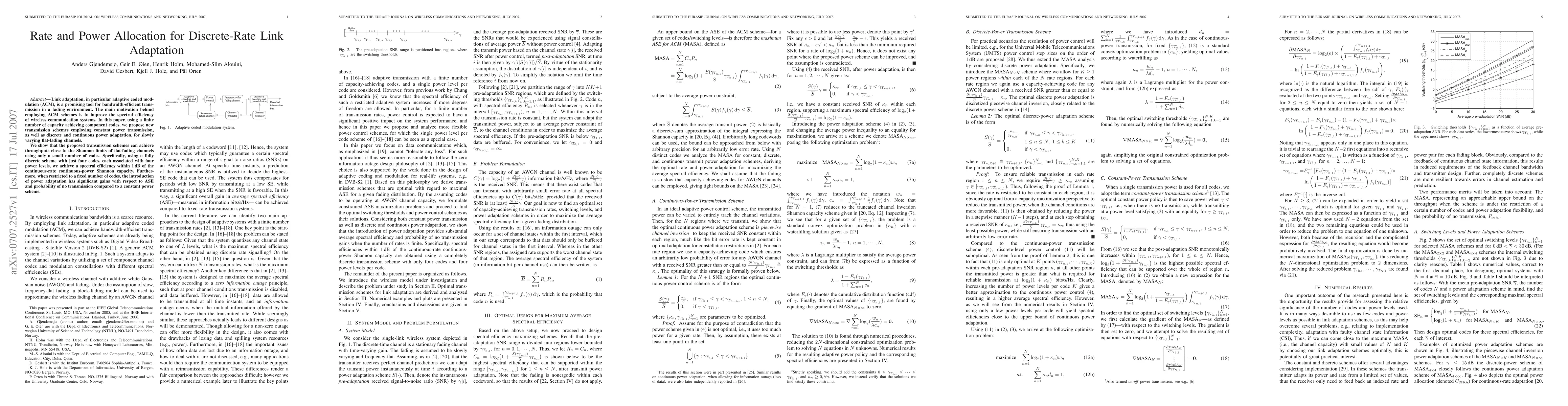 Link adaptation, in particular adaptive coded modulation (ACM), is a promising tool for bandwidth-efficient transmission in a fading environment. The main motivation behind employing ACM schemes is to improve the spectral efficiency of wireless communication systems. In this paper, using a finite number of capacity achieving component codes, we propose new transmission schemes employing constant power transmission, as well as discrete and continuous power adaptation, for slowly varying flat-fading channels. We show that the proposed transmission schemes can achieve throughputs close to the Shannon limits of flat-fading channels using only a small number of codes. Specifically, using a fully discrete scheme with just four codes, each associated with four power levels, we achieve a spectral efficiency within 1 dB of the continuous-rate continuous-power Shannon capacity. Furthermore, when restricted to a fixed number of codes, the introduction of power adaptation has significant gains with respect to ASE and probability of no transmission compared to a constant power scheme.